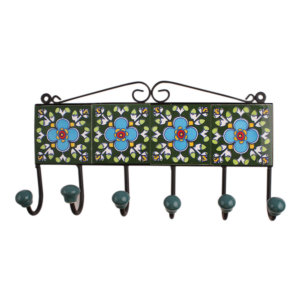 Green Floral Ceramic Tiles Hooks. When put on wall or cabinet it is an art in itself. The metal part of this hook is black powder coated.