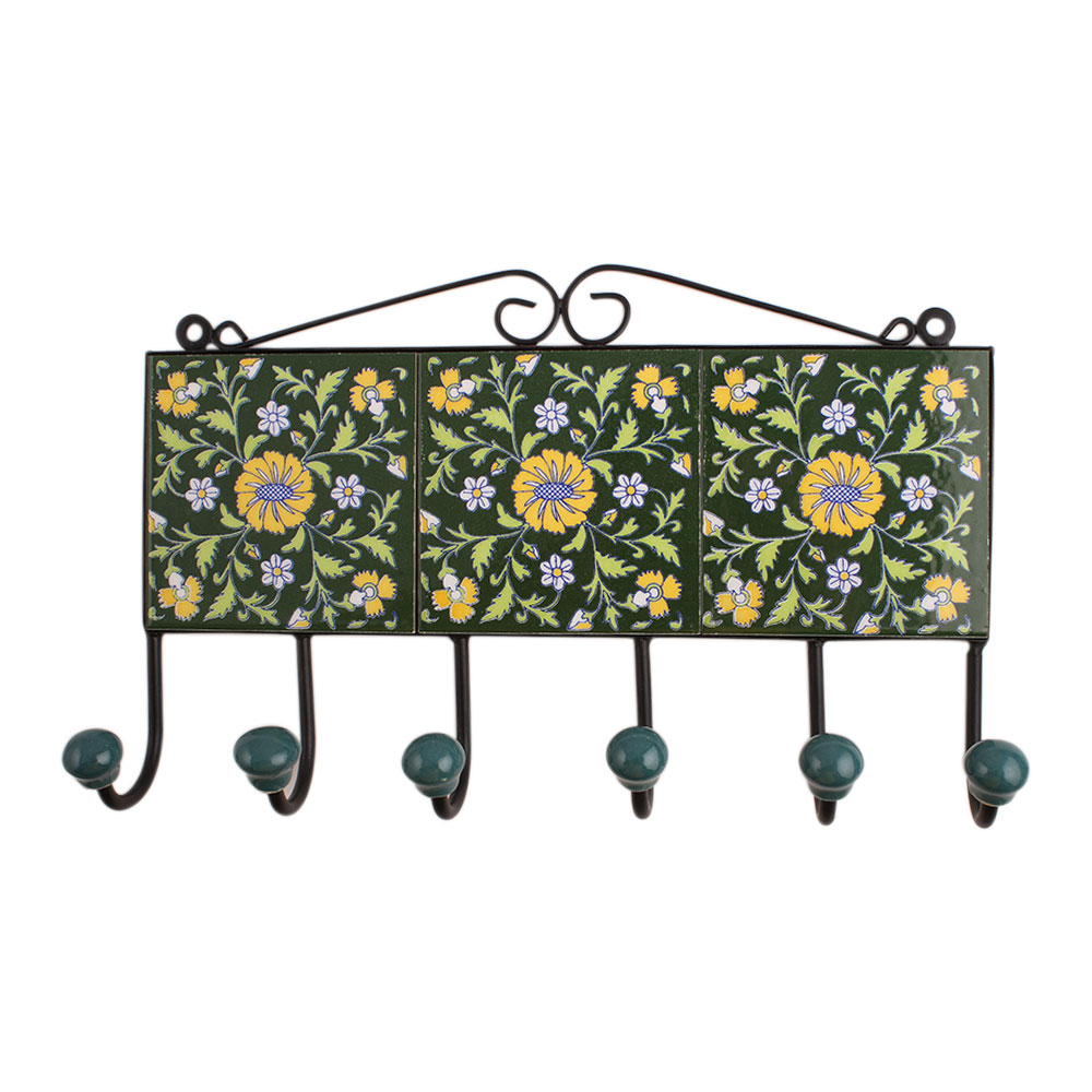 Green Floral Ceramic Tiles Hooks. When put on wall or cabinet it is an art in itself. The metal part of this hook is black powder coated.
