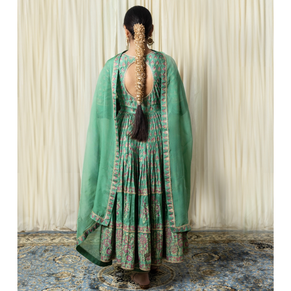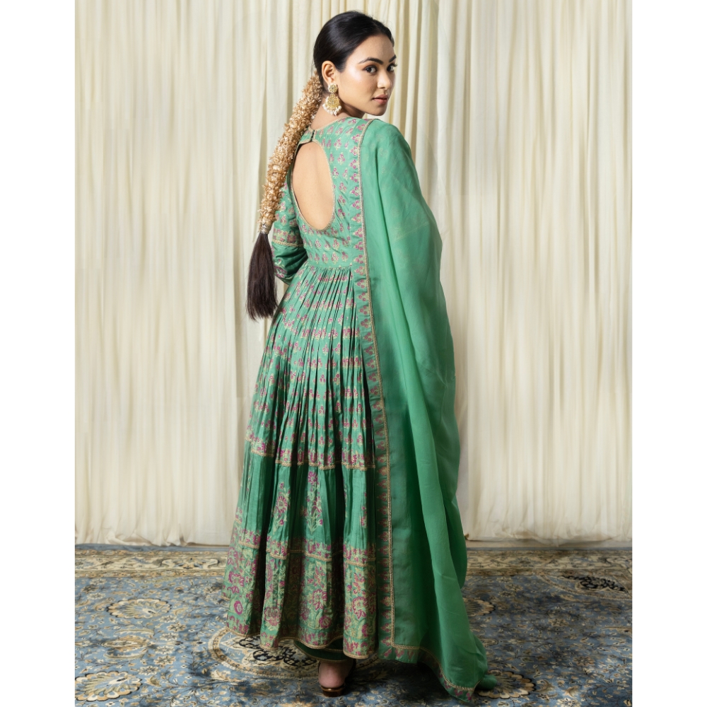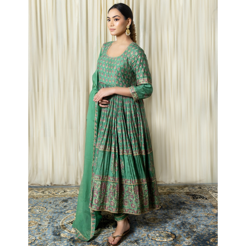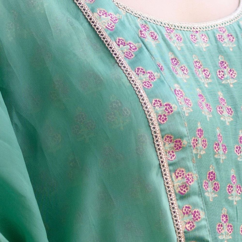 Elevate your ethnic wardrobe with this elegant Green Gathered Anarkali Set, crafted in soft muslin fabric and adorned with intricate hand block prints. The Anarkali features a flattering round neckline and three-quarter sleeves, complemented by fine floral motifs that reflect the richness of Indian craftsmanship. Its gathered silhouette enhances the feminine form while offering comfort and movement. Paired with a breathable cotton bottom in a matching green tone, this ensemble balances style and ease effortlessly. The lightweight viscose organza dupatta adds a graceful layer, finished with printed borders for a refined touch. Perfect for festive gatherings, weddings, or cultural events, this handcrafted suit set brings together traditional aesthetics and modern flair. Whether styled with statement earrings or classic juttis, this green Anarkali set is a timeless piece designed for elegance in every step. Make a lasting impression with this block-printed ensemble, rich in detail, heritage, and sophistication.