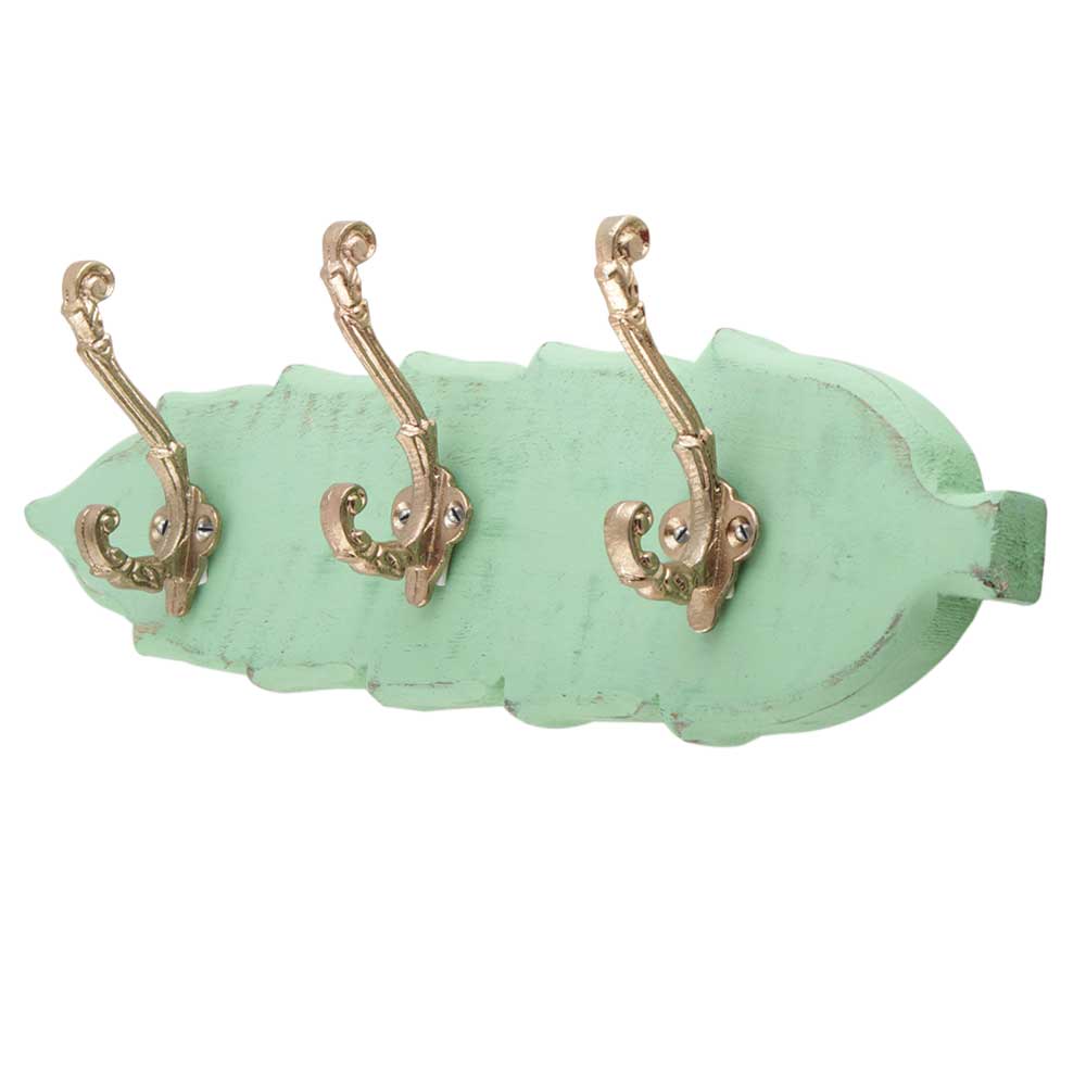 Green And Golden Small Wall Wooden Iron Hooks. A Perfect Complement to the Soft Tone of the Wood are these White Traditional Hat & Coat Hook Made of Genuine Porcelain and Brass. It can be use to Hang Jewellery, Leashes, Towels, Scarves, Light Weight Sweaters, Caps Etc.
