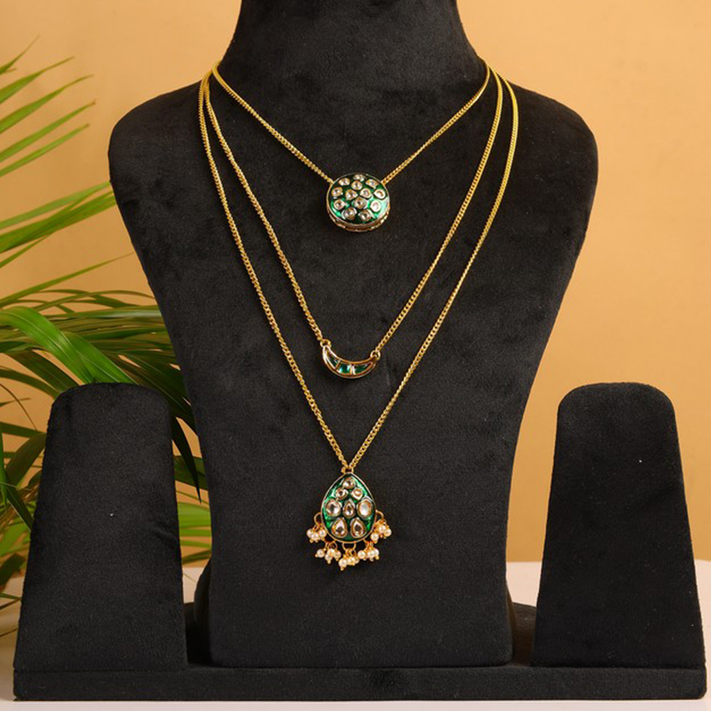 Celebrate individuality with this Green Kundan Multi-Layer Necklace with Gold Tone Chains & Pearl Tassels. Featuring three layers of gold-tone chains adorned with unique pendants a circular pendant, a crescent pendant, and a teardrop pendant with pearl tassels each embellished with green and clear kundan stones, this statement piece is perfect for bridal ensembles, festive occasions, and meaningful gifting. Packed & quality-checked by Indianshelf.