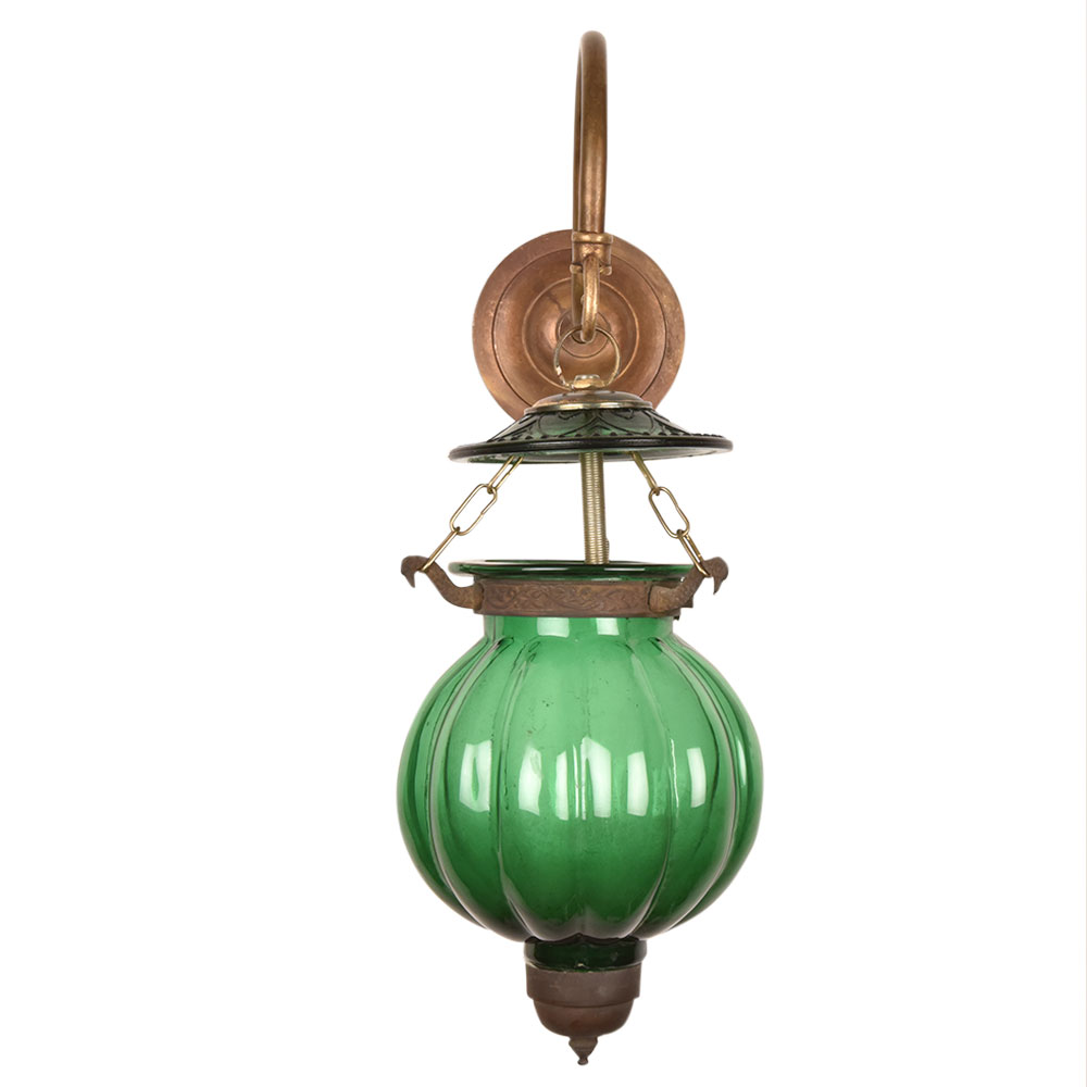 Green melon shaped glass hanging lamp on bronze bracket. The lamp is unique and allows a great lighting option for any room.