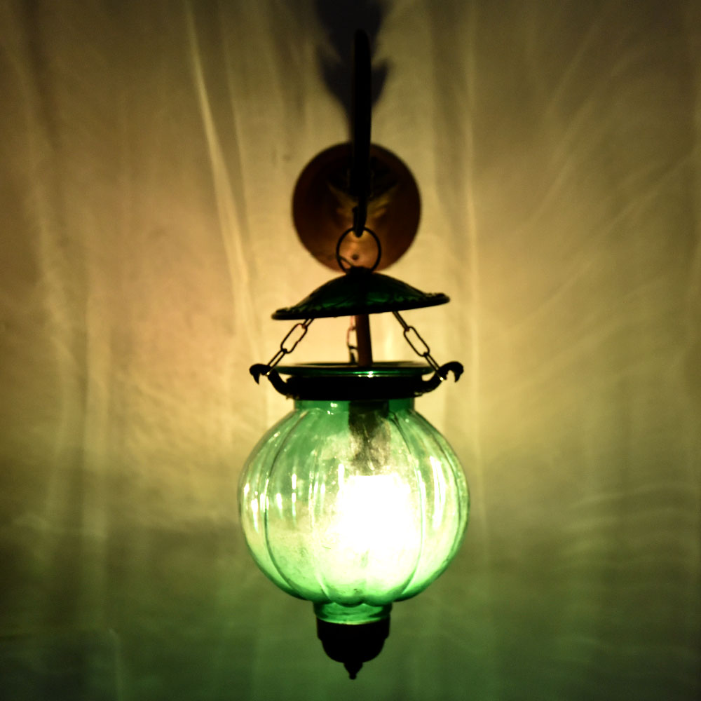 Green melon shaped glass hanging lamp in leafy bronze bracket. The lamp is unique and allows a great lighting option for any room.