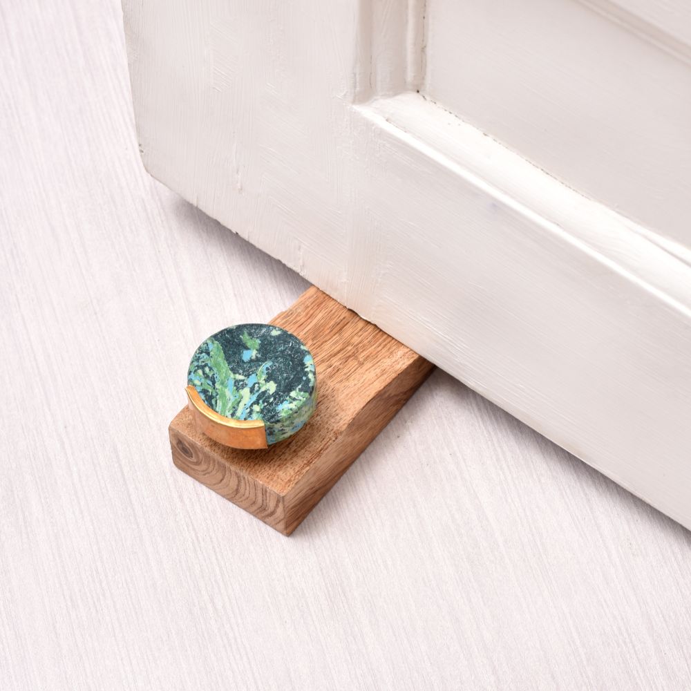 Buy a wooden door stopper online which is a masterpiece crafted with precision by highly skilled and experienced Indian craftsmen. Made from high-quality wood, it boasts an antique brown finish that adds a touch of timeless elegance to any space. Atop this elegant piece rests a mesmerizing blue and green coloured stone, which further enhances its aesthetic appeal. Designed to be both functional and stylish, our door stopper features a rubber grip underneath ensuring it stays firmly in place preventing any unwanted slipping or sliding. This practicality makes it an ideal choice for daily use in homes or offices. With its impeccable craftsmanship and attention to detail, our handmade door stopper is not only a practical accessory but also a unique gift option. Perfect for special occasions like housewarmings, it's a thoughtful present that will be cherished by your loved ones.
