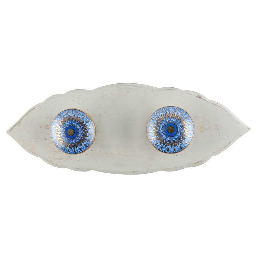 Finish: Glossy blue patterned ceramic on matte grey-painted wood