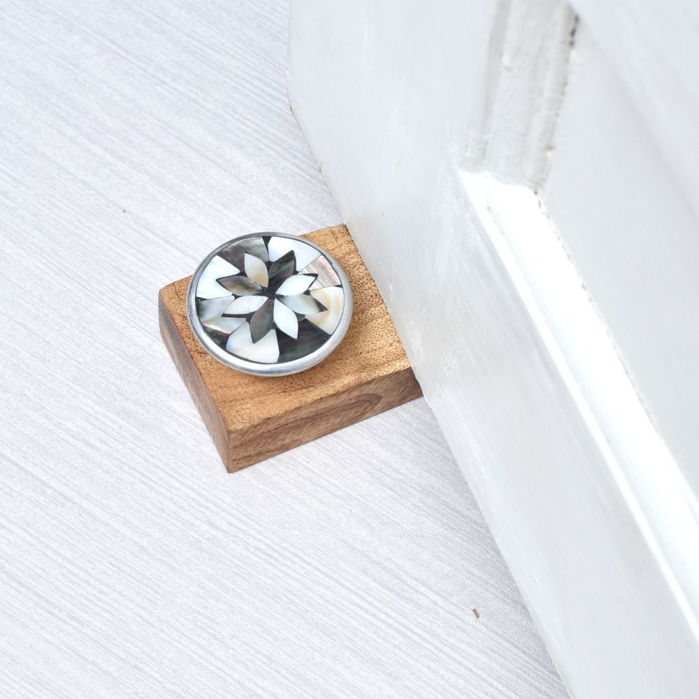A Wooden Door Stopper which is a perfect blend of elegance and functionality. Crafted from premium-quality wood, this door stopper boasts a timeless antique brown finish that adds a touch of sophistication to any space. What truly sets it apart is the exquisite mother of pearl engraving featuring a stunning white and grey coloured flower design, showcasing the artistic brilliance of skilled Indian artisans. Designed to serve its purpose flawlessly, this door stopper is not only a beautiful decorative piece but also highly practical. Its sturdy construction ensures reliable door holding, while the rubber grip beneath guarantees a secure placement without any slipping. With its impeccable craftsmanship and thoughtful details, it makes an ideal gift for your loved ones on special occasions like housewarmings, symbolizing warmth and protection in their new abode.