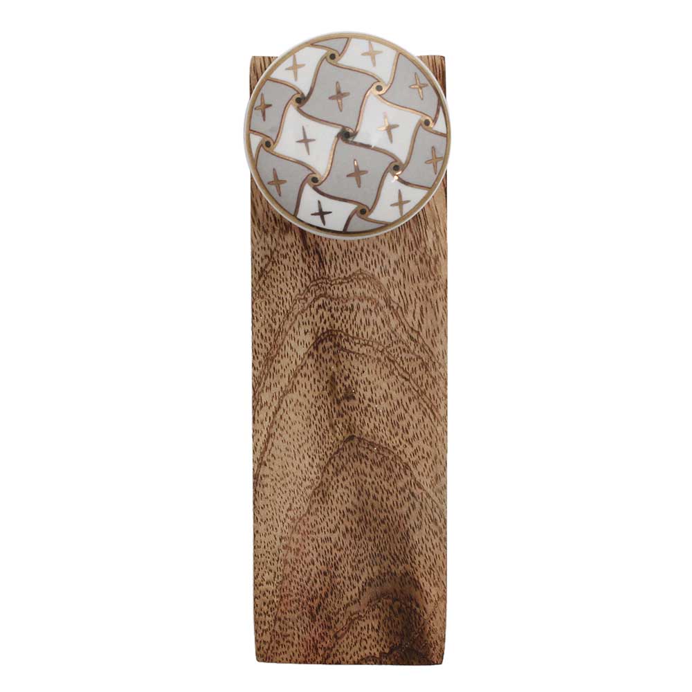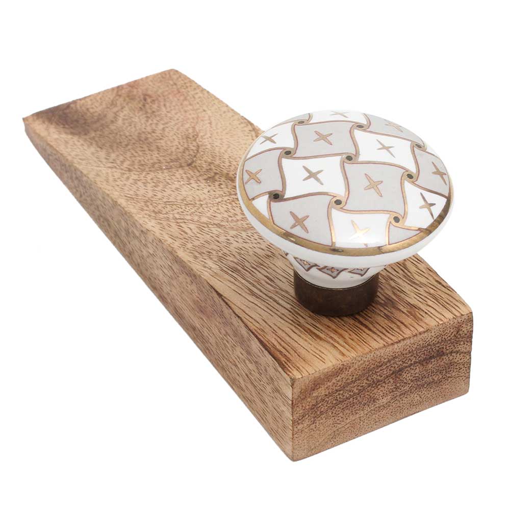 Handmade Ceramic Wooden Door Stopper.Wooden Door Stopper with a Ceramic Knob to Carry it Easily. This Wooden Door Stopper has Glue Dots under it to Ensure that it does not Slip. It is Handmade by the Craftsmen of India and this Innovative Door Stopper won't Disappoint You.