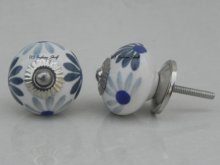 Grey Blue Flower Ceramic Knob. Ideal for kitchen cabinets, kitchen drawers, dining room, bed room, chest drawers, dressing tables, almirah