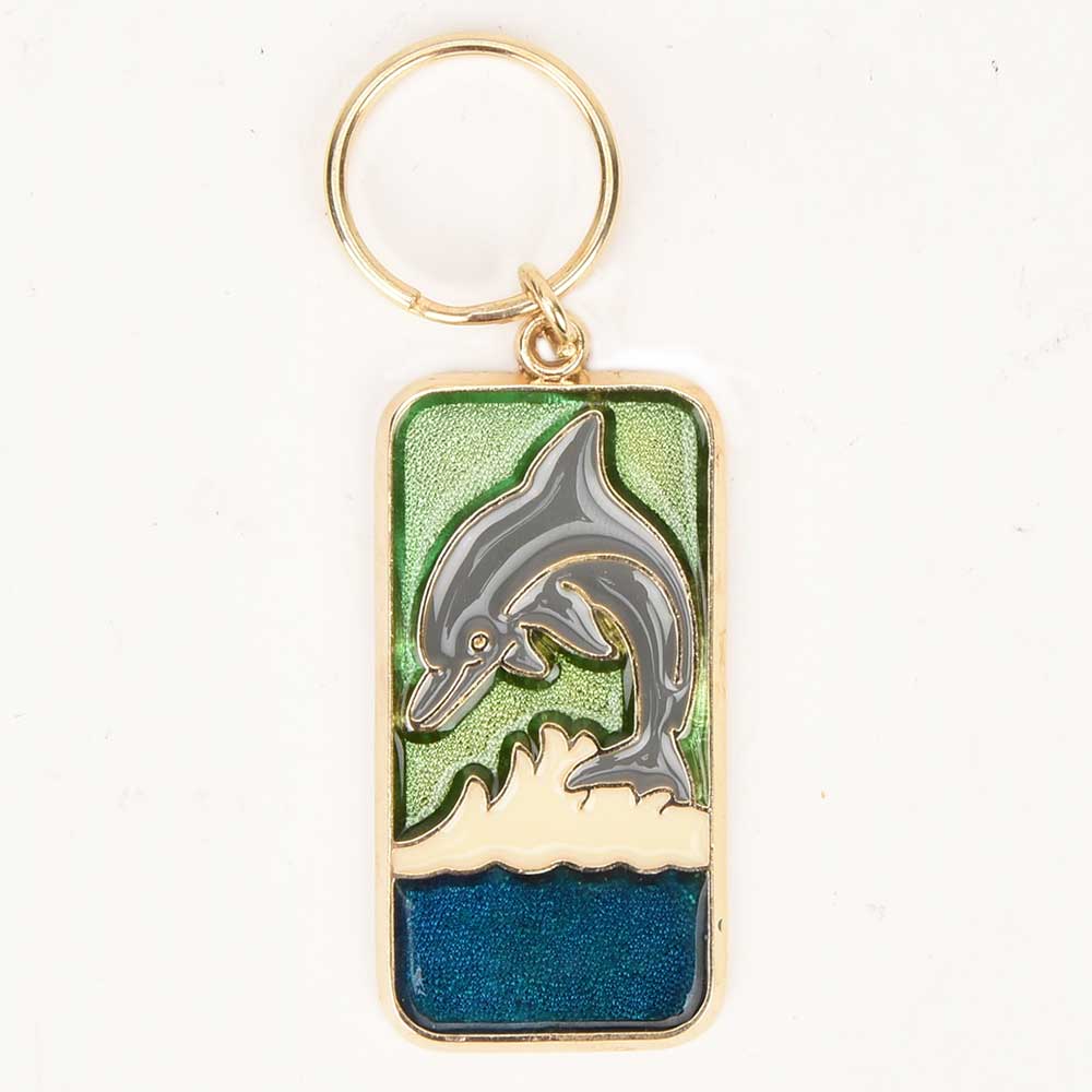 Grey Dolphin With Green Blue Colors On Brass Key Chain.