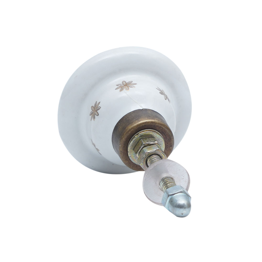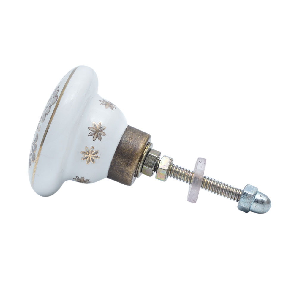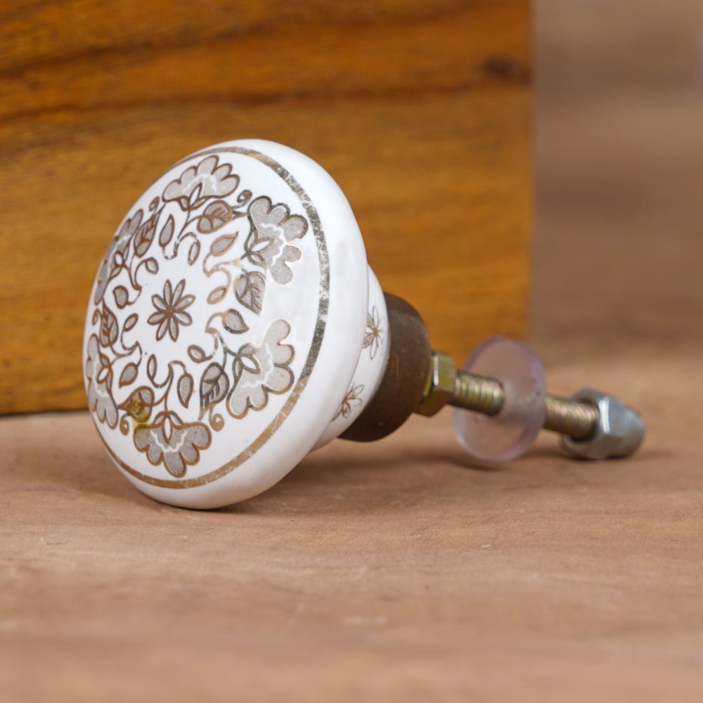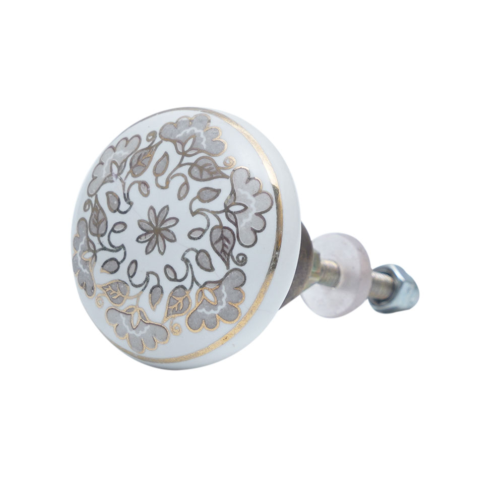 This beautifully crafted round knob is made of ceramic and has a white finish with intricate floral engravings in golden colour and grey fillings. It is a handmade piece of art by skilled artisans from India who have put in a lot of effort and attention to detail in creating this exquisite piece. The knob can be used as a kitchen cabinet handle or knob, dresser handle or knob, or as a handle for a wardrobe or almirah. This knob is not only functional but also adds a touch of elegance to any piece of furniture it is used on. It is perfect for those who want to add a unique and sophisticated touch to their kitchen cabinet handles and knobs or door handles and knobs. This knob can also be gifted to your loved ones on special occasions like housewarming or birthdays.