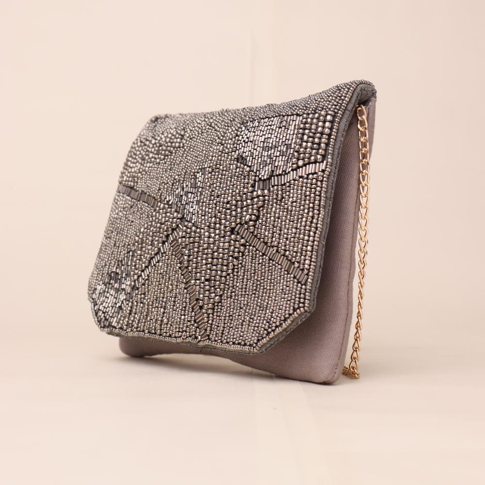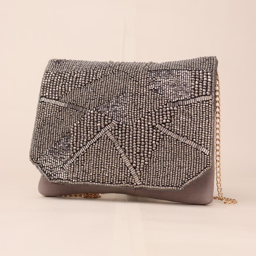 Add a touch of modern glamour to your outfit with this sophisticated grey beaded clutch. Adorned with intricate hand-beaded geometric patterns in metallic tones, this evening bag is the perfect companion for weddings, cocktail parties, and festive soirées. The sleek grey base complements the shimmer of the beadwork, while the gold chain strap offers versatile styling. Compact yet spacious enough for your essentials, this handcrafted piece makes a graceful style statement.