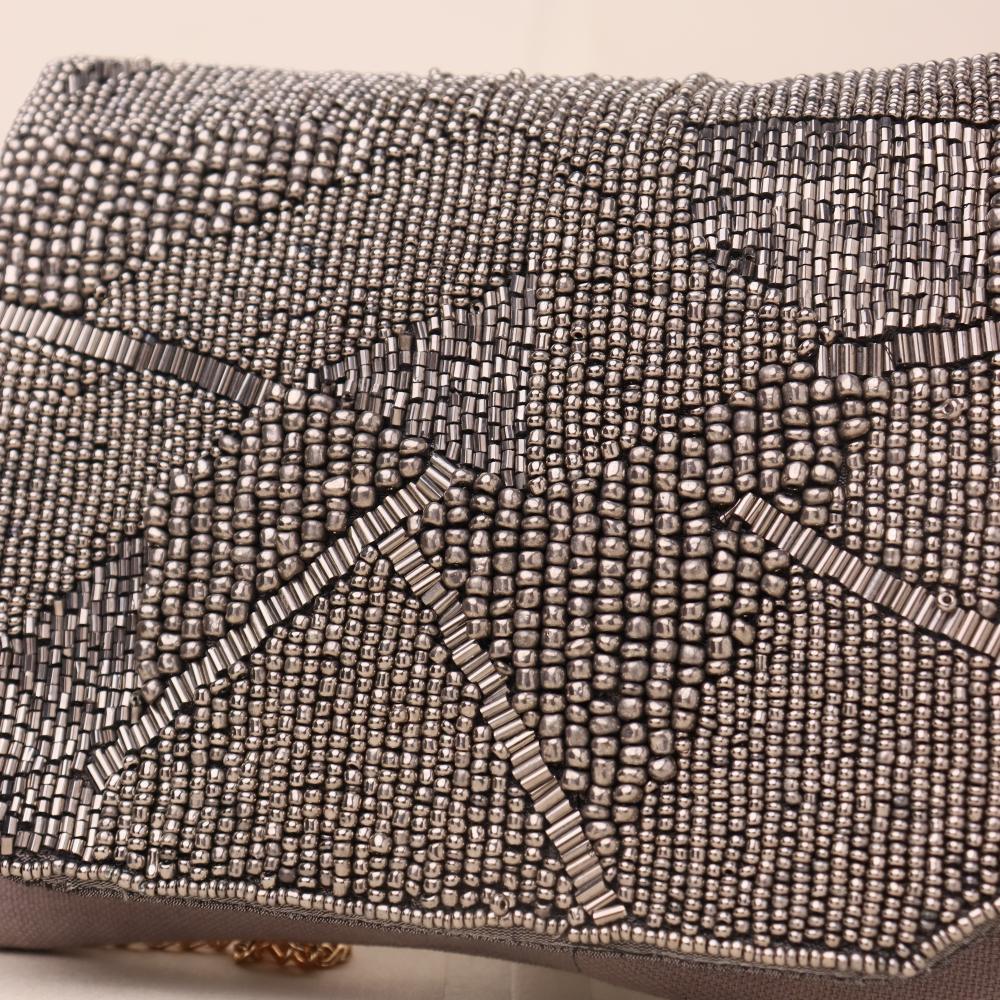 - Design Pattern: Hand-beaded geometric design in silver and gunmetal tones