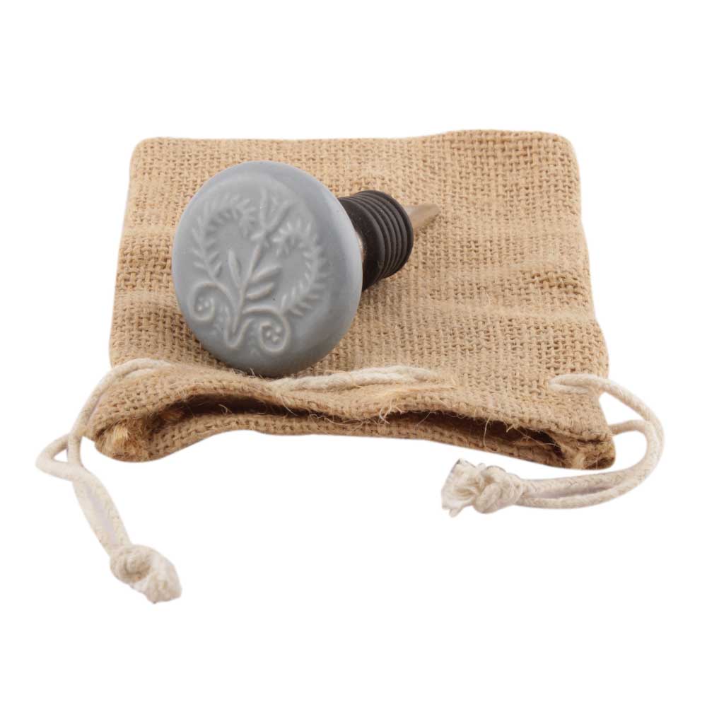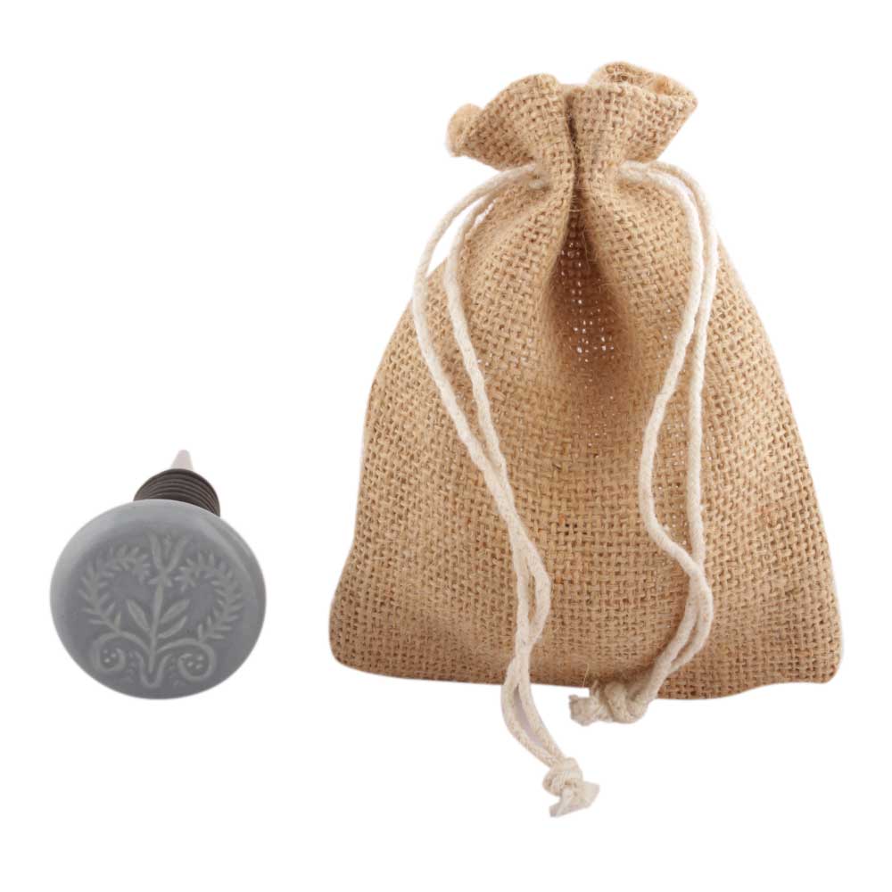 Grey Leaf Ceramic Wine Stopper. Zinc Alloy Wine Bottle Stopper with Attractive Jute Bag Packaging.