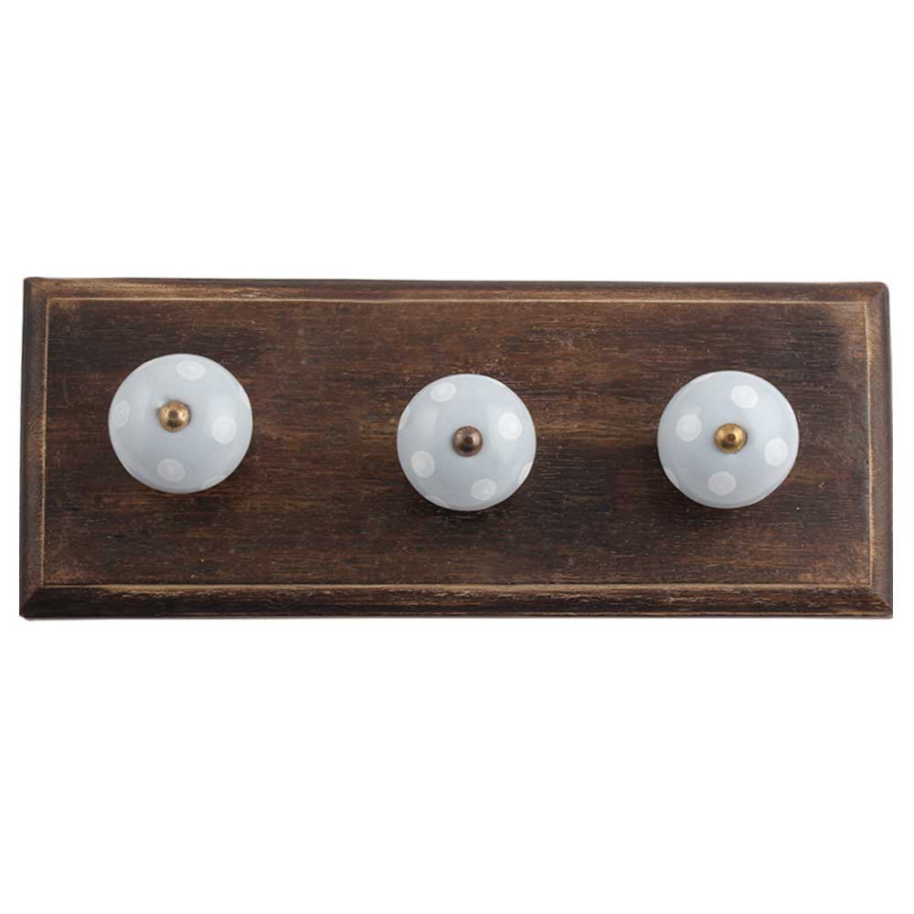 Grey White Dot Wooden Hooks . A Perfect Complement to the Soft Tone of the Wood are these White Traditional Hat Coat Hook Made of Genuine Porcelain and Brass. It can be use to Hang Jewellery, Leashes, Towels, Scarves, Light Weight Sweaters, Caps Etc.