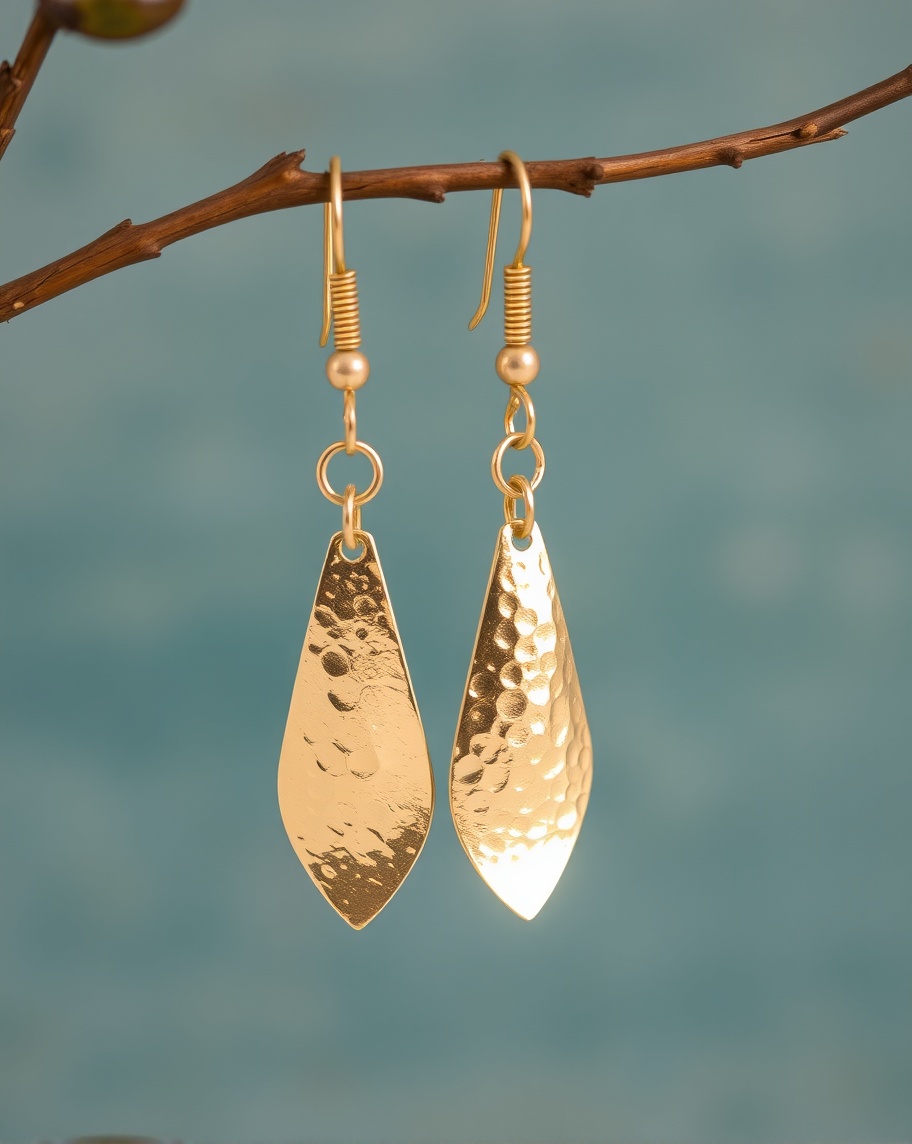 The Hammered Leaf Shape Dangle Earrings draw inspiration from nature’s organic beauty, blending artisanal texture with golden brilliance. Handcrafted from fine brass and plated in gold, these earrings feature a delicate leaf silhouette with a hammered surface that captures light with every movement. The combination of nature-inspired form and artisan craftsmanship makes them a timeless addition to any jewelry collection — perfect for everyday elegance or statement styling.
