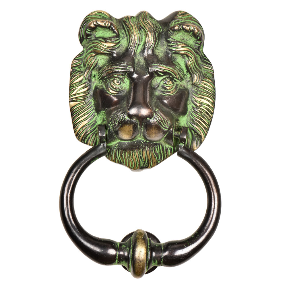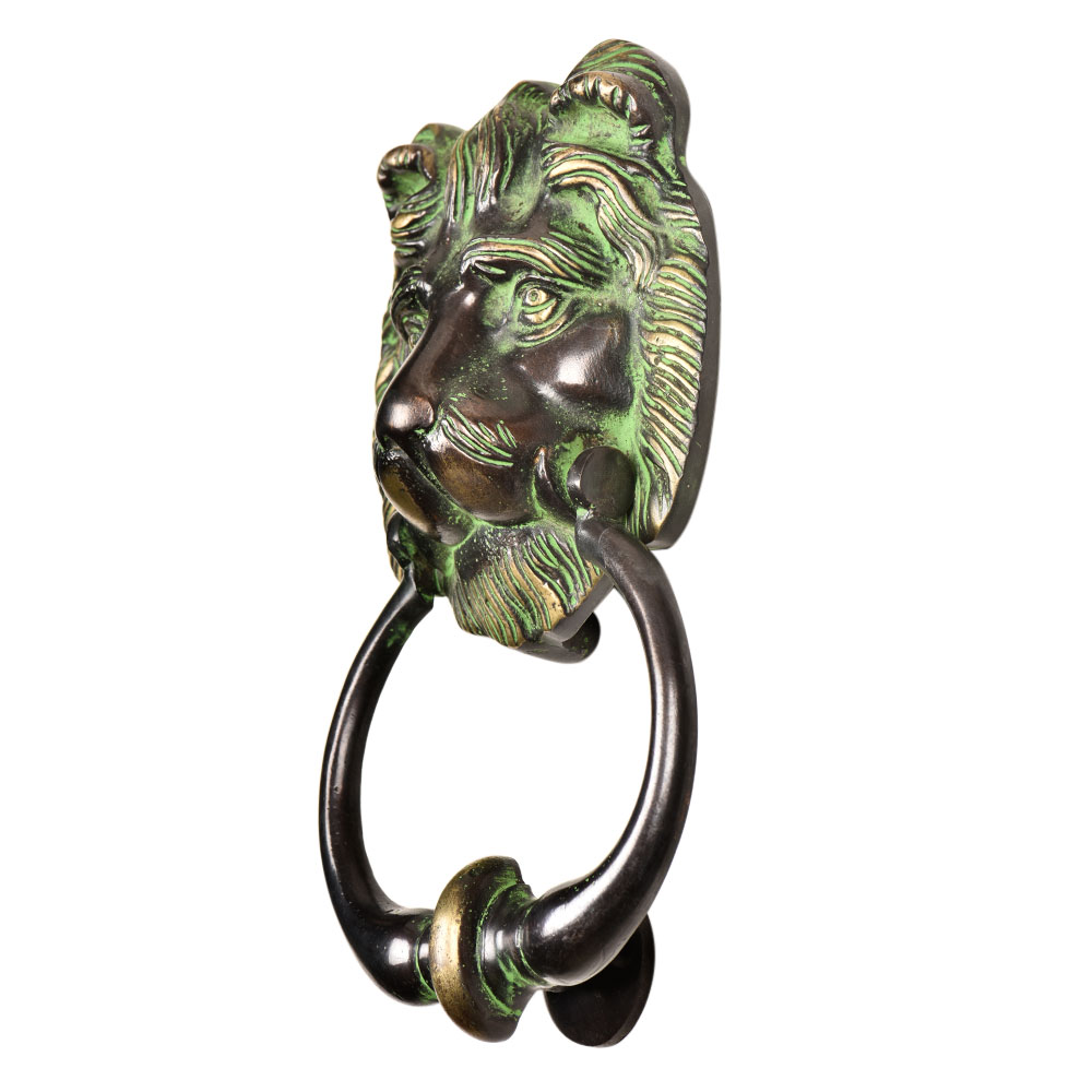 Bring the inviting warmth of nature to your front door with the addition of the lion Head door knocker. Made of solid brass, this door knocker includes matching mounting hardware and striking plate. Lion door knockers is an ideal decorative accent for a front entryway and is a great way for stylishly announcing a visitor.Comes with a rich patina.