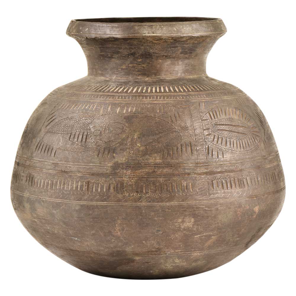 This Handmade Water Pot has Unique Carvings and Engravings Covering Its Surfaces Along with Beautiful Flowing Floral Patterns. The Brass is oxidized, making a stark relief to the bright carvings of the brass Itself. Used to Store Water at a Cooler Temperature. It Rests Calmly on the Rounded Base, and Can Be Easily Lifted by the Tufted Neck. The Carvings Extend Over the Lip of the Edge of the Pot and Into the Inner Surfaces as Well. This Piece Would Make a Wonderful Topper to An Accent or Corner Table in a Room, and the Subtle Colors Make It the Perfect Accompaniment to Any Room's Decor.