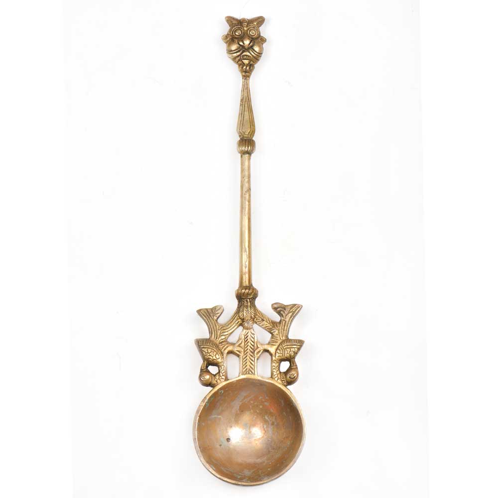 This is an intricately carved pooja spoon made of brass is used for offering worship during puja or havan . The spoon has a small bowl to fill holy water or oil with a decorative finial and an abstract design on the top and bottom of the spoon . Use it as a home décor product or as a gifting option for family and friends.
