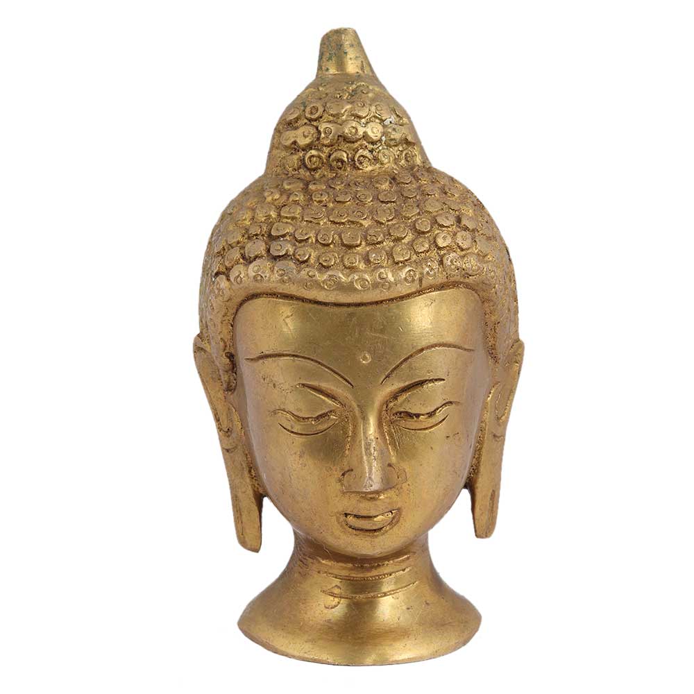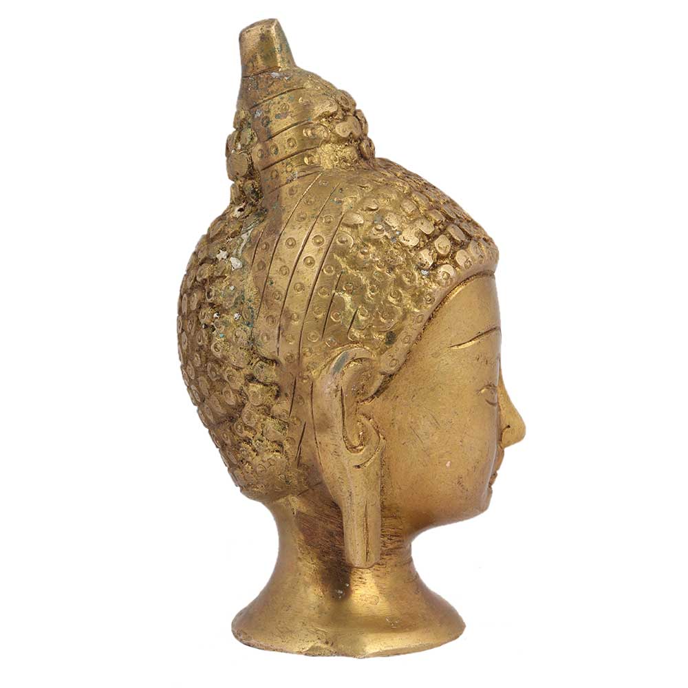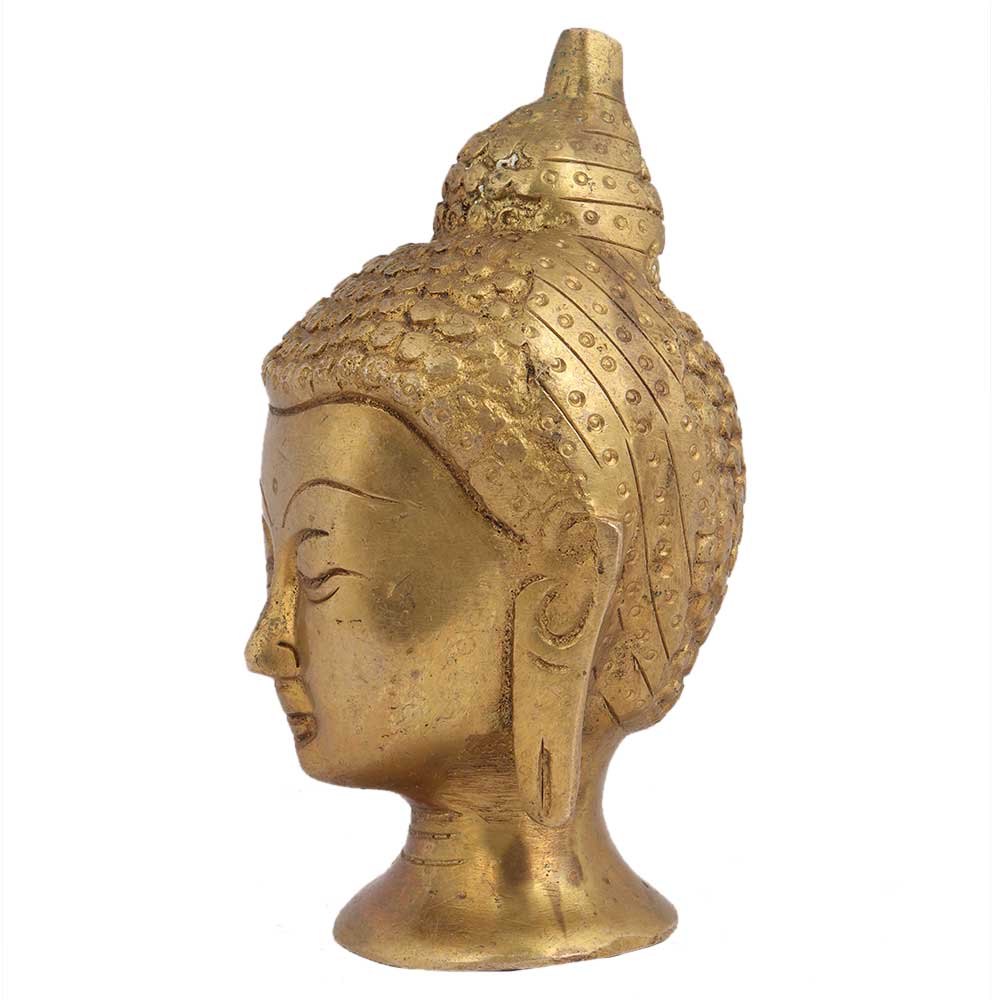 Hand Crafted Golden Brass Buddha Head Statue with curly hair tied in a bun and eyes closed in meditation with long hanging earlobes. Gift it to your near and dear ones on Diwali, new year , Christmas, new year, wedding gift, birthday gift or house warming gift.