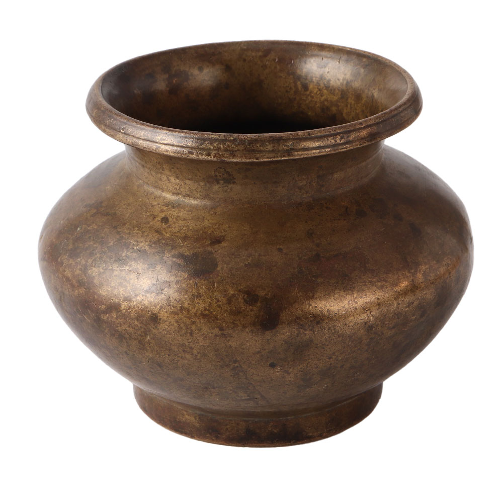 An antique brass water pot used in Hindu religion. It is ornamental with a classic round pot shape and was likely constructed as a lota or water carrying vessel. This is a wonderful artwork to exhibit and will appeal to fans of vintage art.