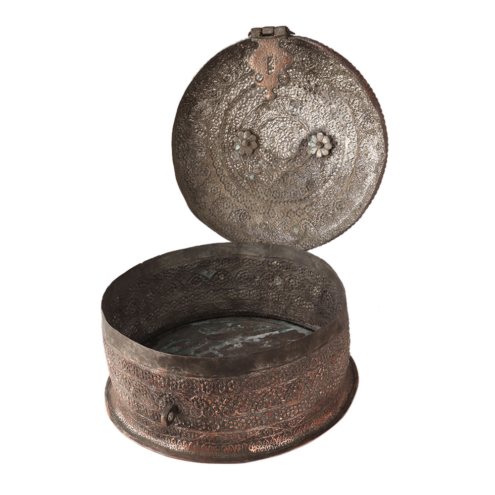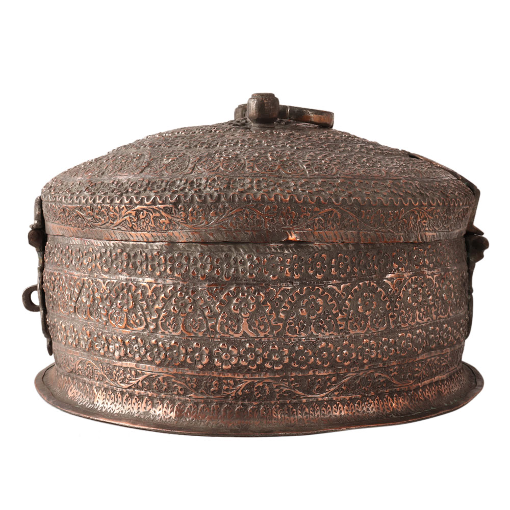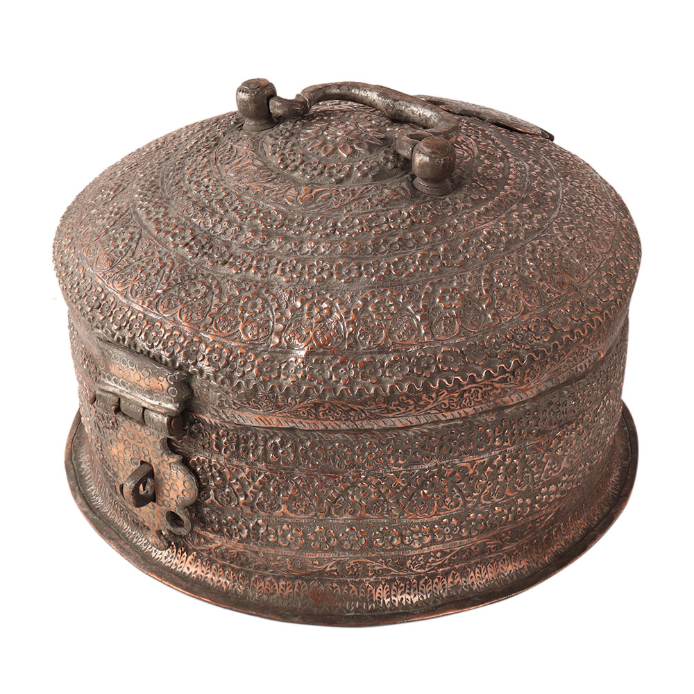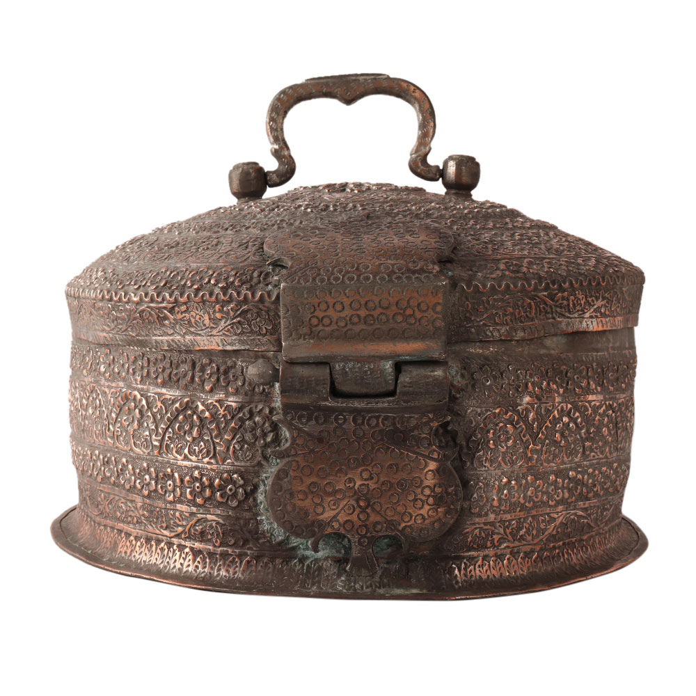 This copper jewelry box has a round shape and a handle on the top. It is handmade by Indian artisans and engraved with Islamic art. A treat for vintage collectors to store your precious items.
