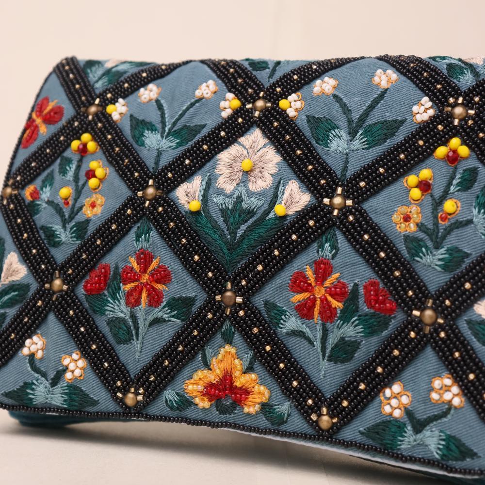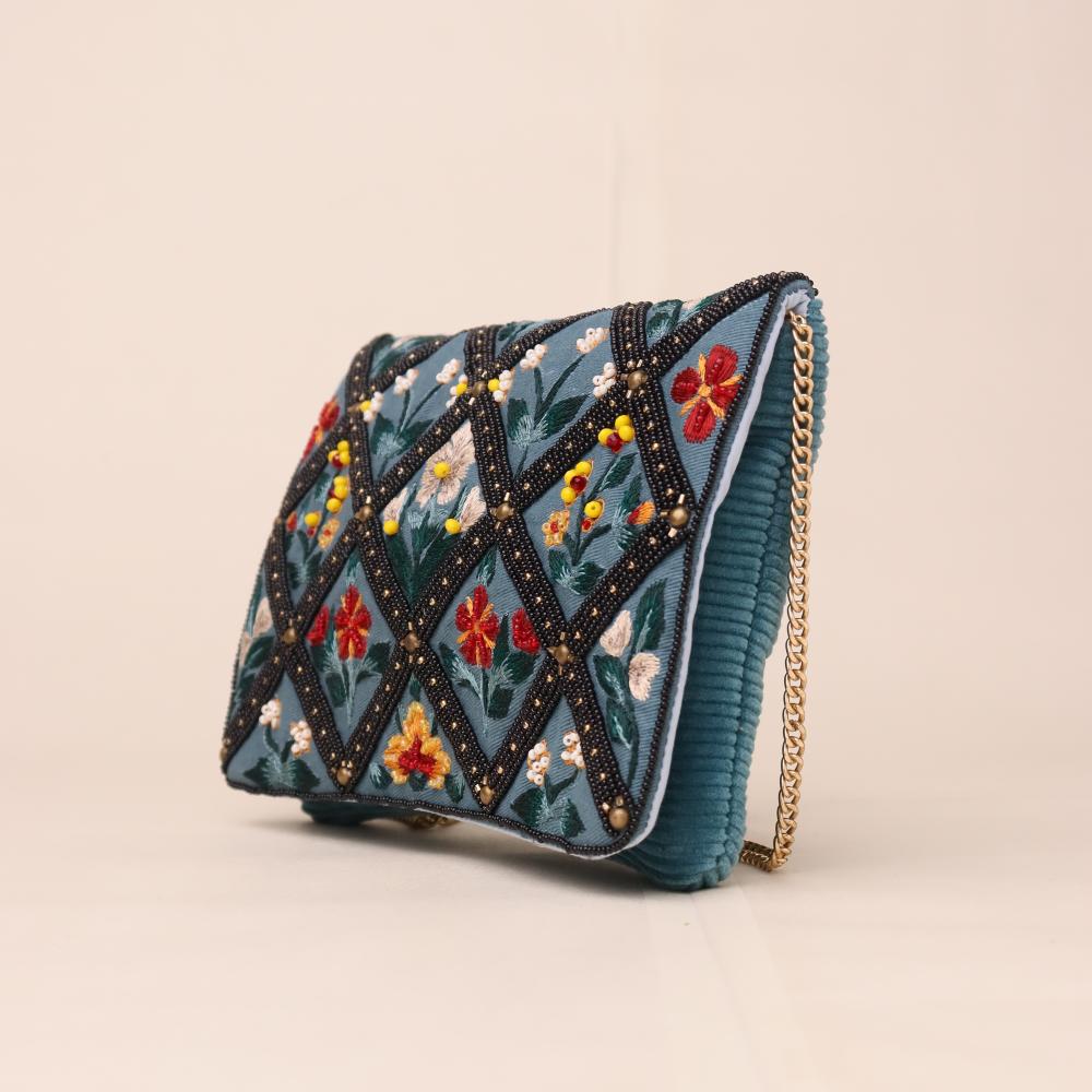 Add a touch of vintage elegance to your outfit with this handcrafted sling bag featuring intricate floral embroidery in a diamond grid design. The soft velvet base enhances its regal charm, while the beaded detailing adds texture and sparkle. Perfect for weddings, brunches, or gifting, this versatile accessory comes with a gold chain strap for crossbody ease or clutch styling.