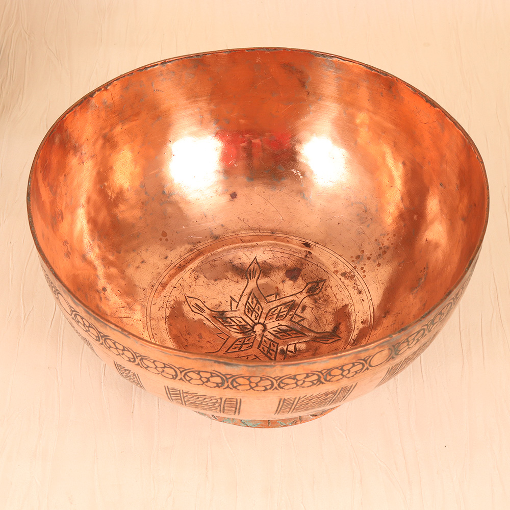 - Intricate floral and geometric designs etched into the gleaming copper surface