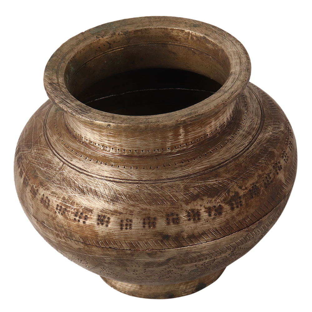 This beautiful brass water pot is hand engraved by local artists in India. It can be used for worship of the god, for rituals or as a stage decoration, flower pot.