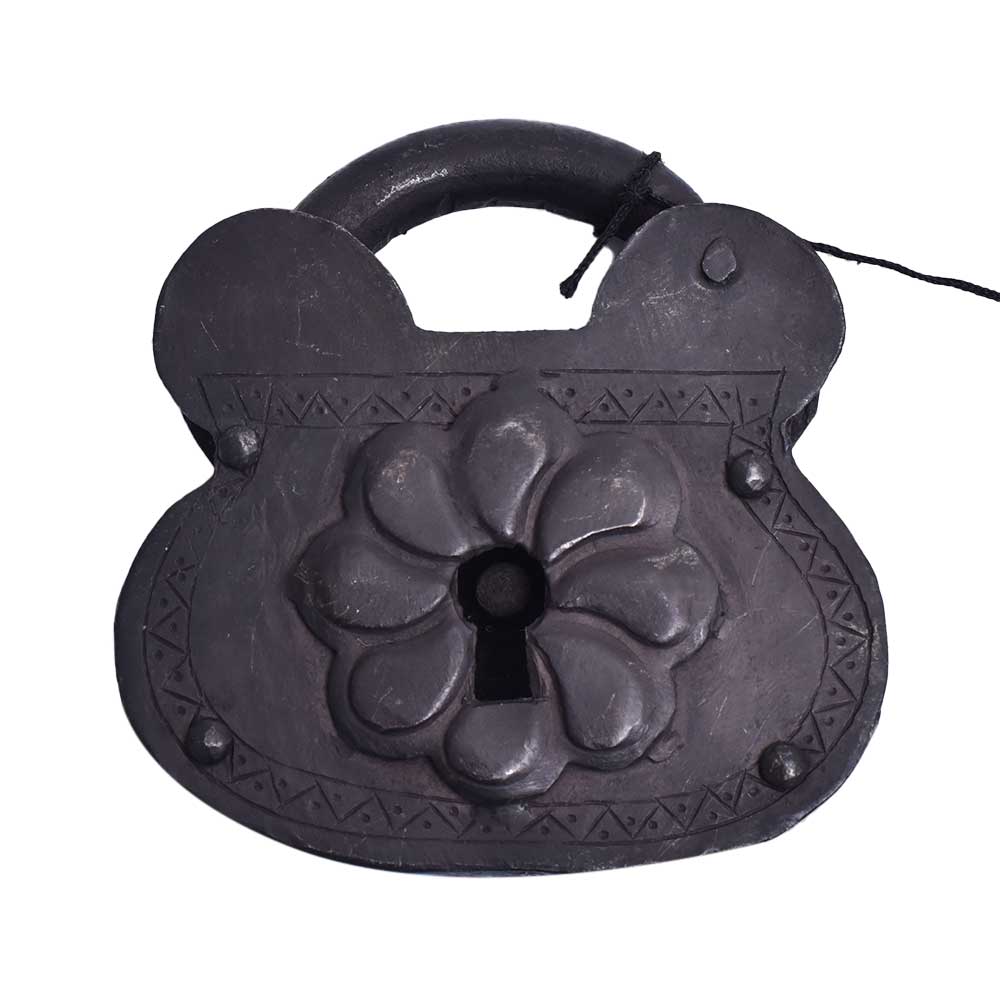Set of a cast-iron lock and key. Key fits in the on one side located keyhole. However, because it is not intended to be an actual lock, the lock will not work when pulled on. Cast iron is used to create a rustic, vintage look.