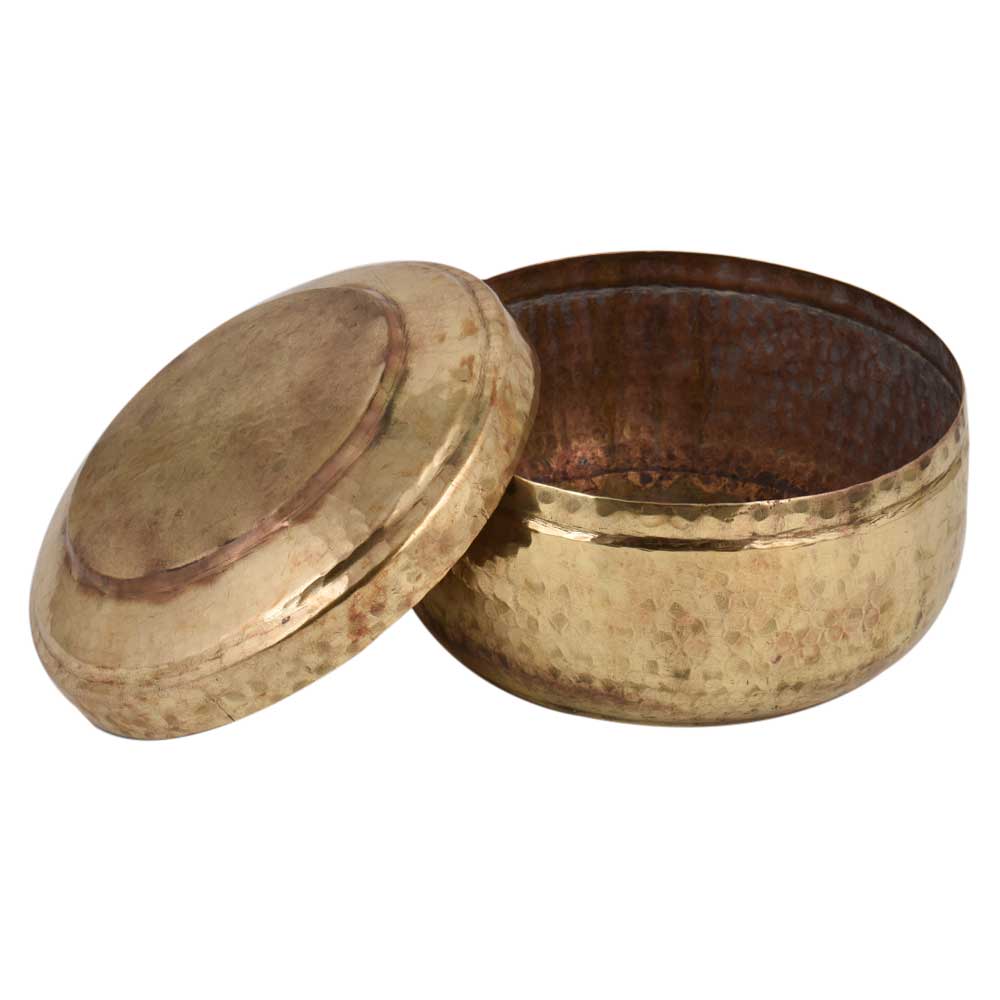 Hand hammered brass round storage box with a raised design on the lid of the box. Use it to store your jewelry , valuables ad other items safe. Gift tit to your near and dear ones n diwali, weddings, anniversary, birthday and other special occasions.