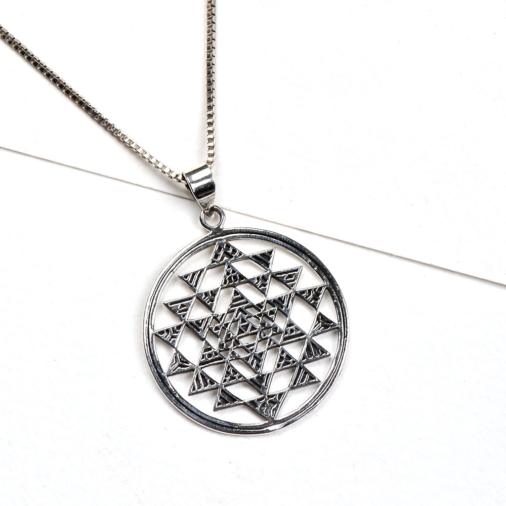 A very auspicious hand crafted 92.5 sterling silver pendant with small triangles shri yantra design inside the circle. It can be worn with traditional as well as modern outfit . Gift it to our friends,mother on Diwali, Anniversaries, graduation, ring ceremony, school functions etc.