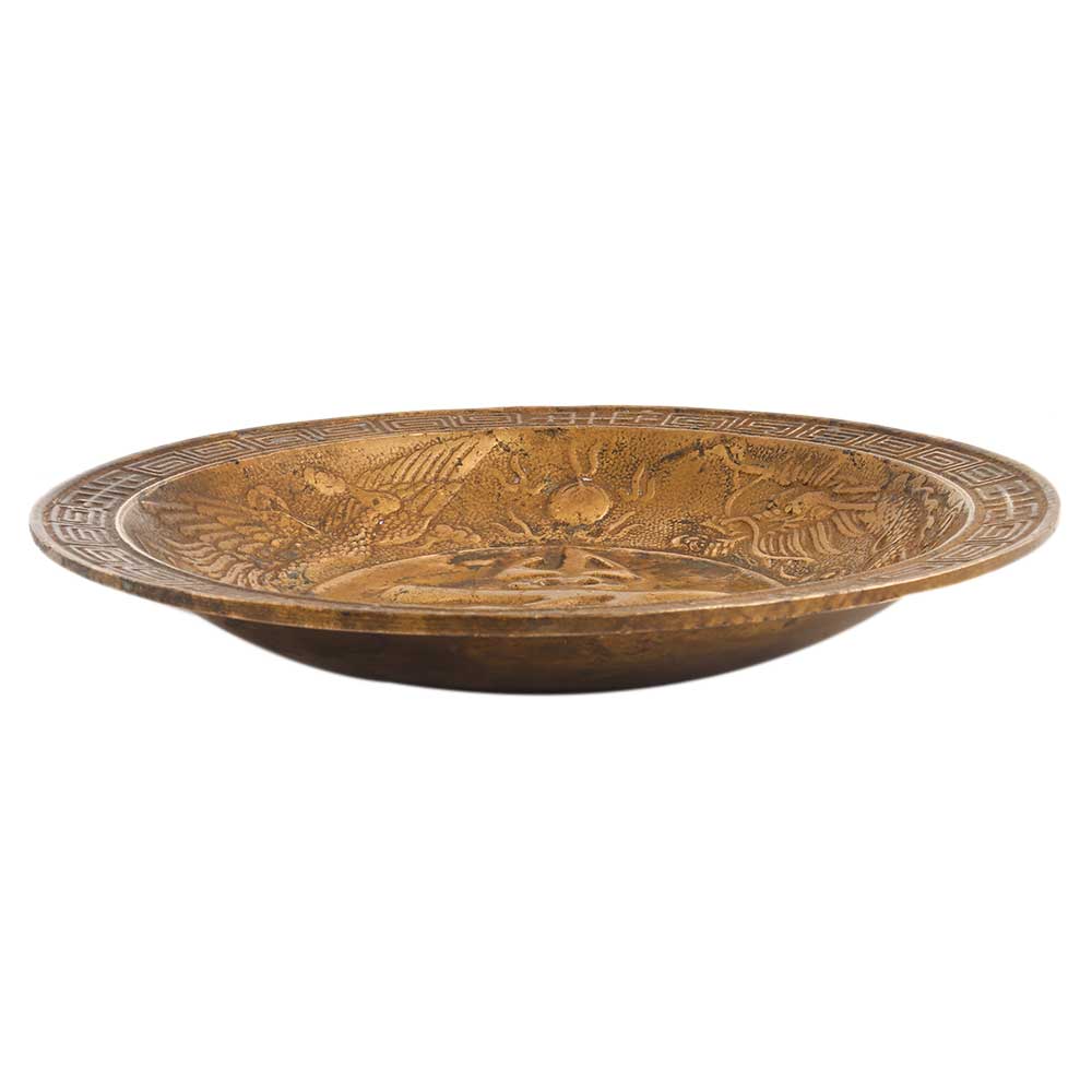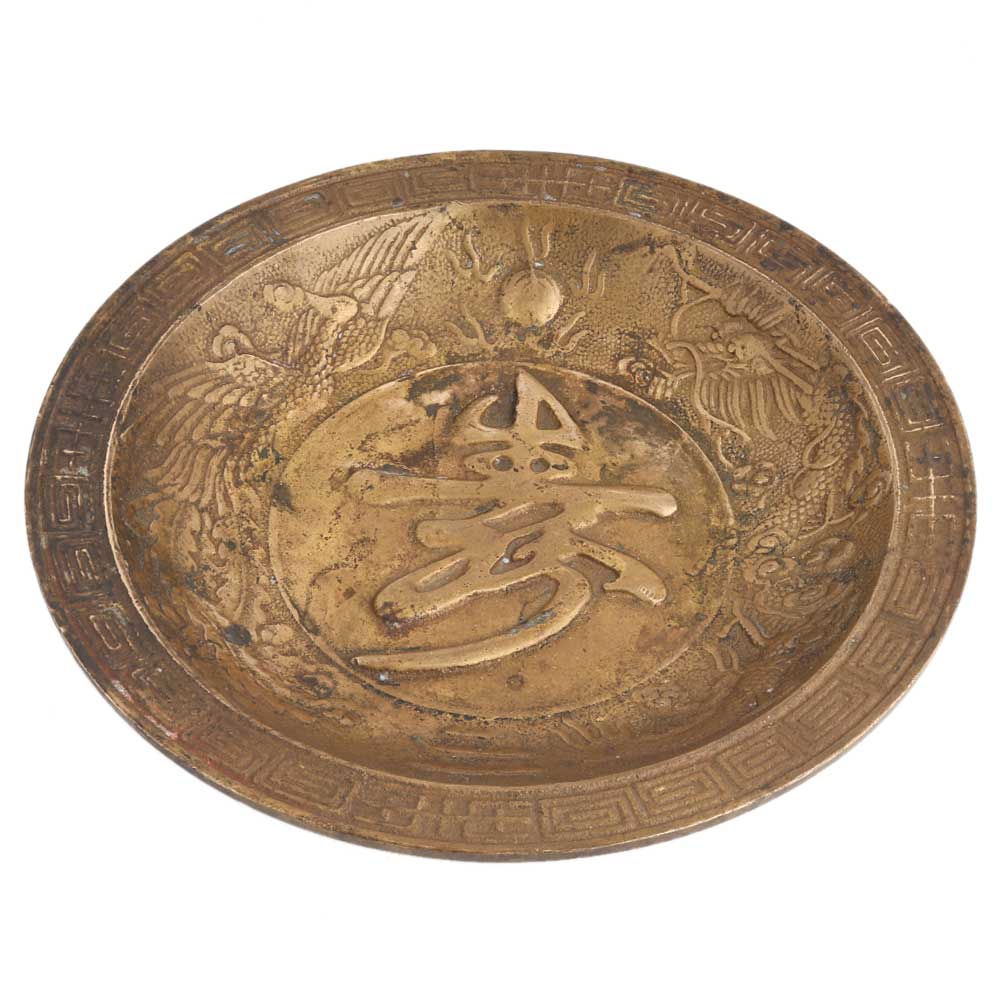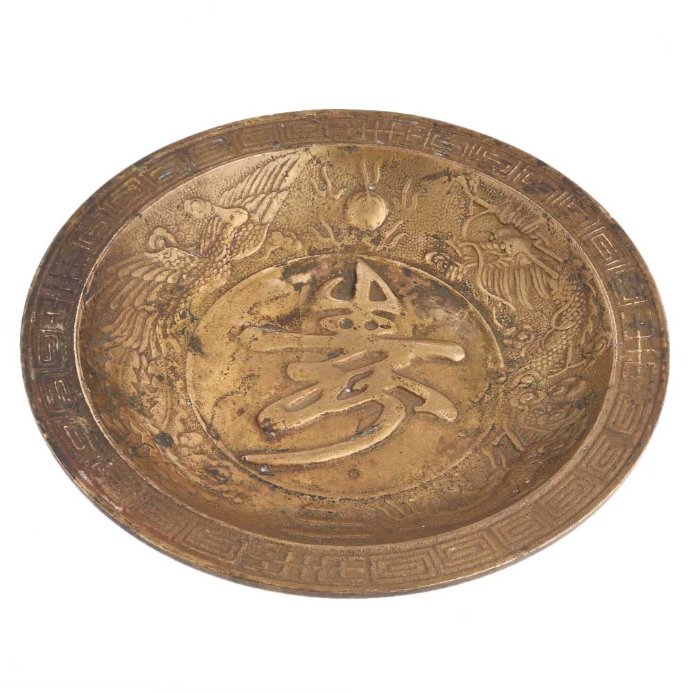 This old brass plate or wall hanging has carved elaborate decorations depicting entwined leaves and birds on the outer edge, with punching decorations in between. You can also use it as a gift.
