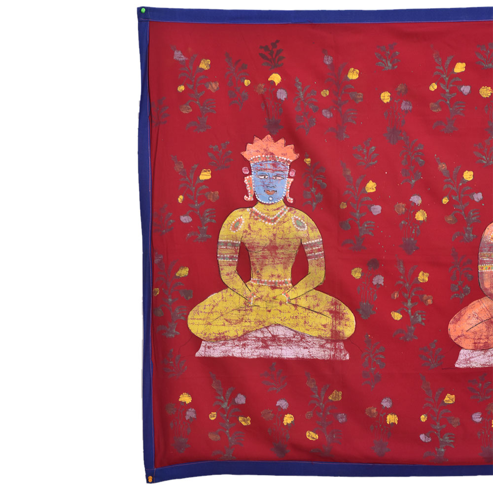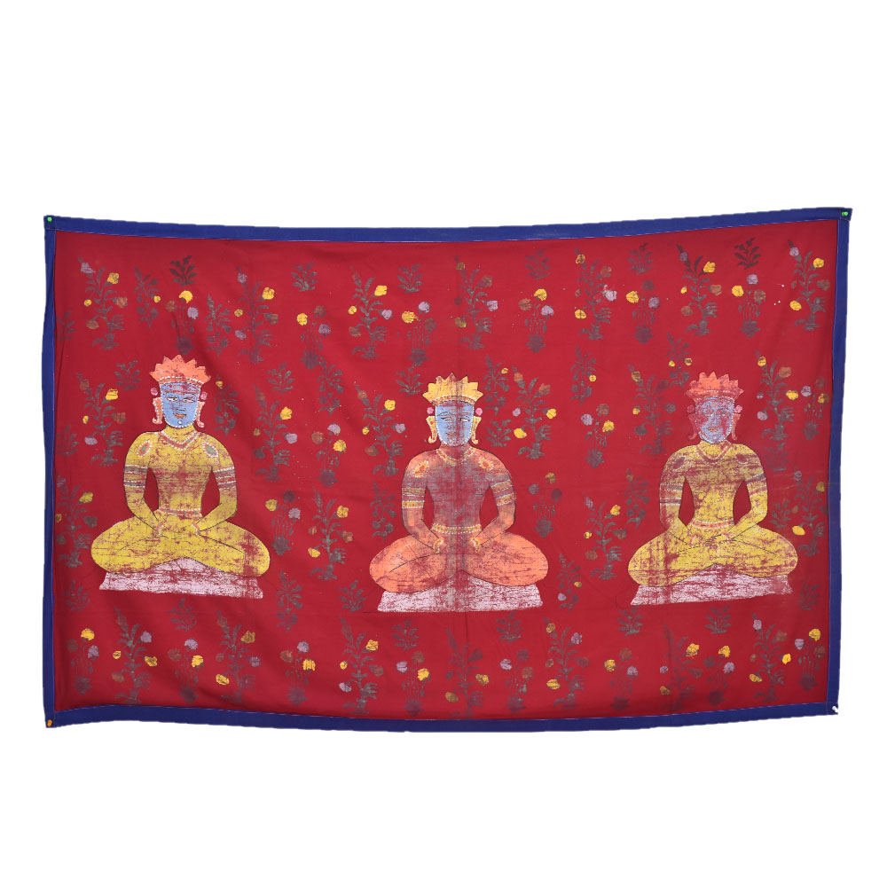 Hand-painted meditation 3 Jain guru on red cloth wall hanging is a beautiful representation of the Jain religion, which has its roots in ancient India. The painting depicts three of the most important Jain gurus or spiritual teachers. Each of these gurus has a significant role in Jainism and is revered by millions of followers around the world. The painting is made on red cloth, which symbolizes purity and devotion. The red color is associated with the fire element and is believed to represent the burning desire for spiritual liberation. The three gurus are depicted in the center of the painting. The painting captures the serene and meditative mood of the three gurus, with their eyes closed in deep contemplation. The intricate details of the painting, such as the delicate folds of their robes, the intricate jewelry adorning their bodies, and the serene expressions on their faces, are a testament to the skill and craftsmanship of the artist. In conclusion, the hand-painted meditation 3 Jain guru on red cloth is a beautiful representation of the Jain religion and its three most important gurus. It is a symbol of devotion, purity, and spiritual liberation, and serves as an inspiration for those seeking enlightenment and inner peace.