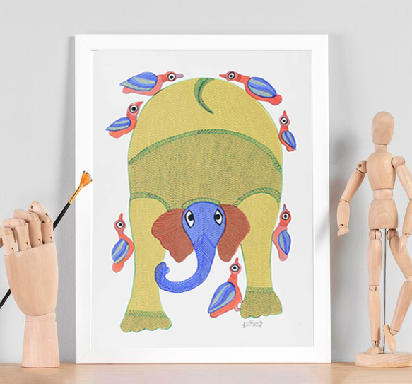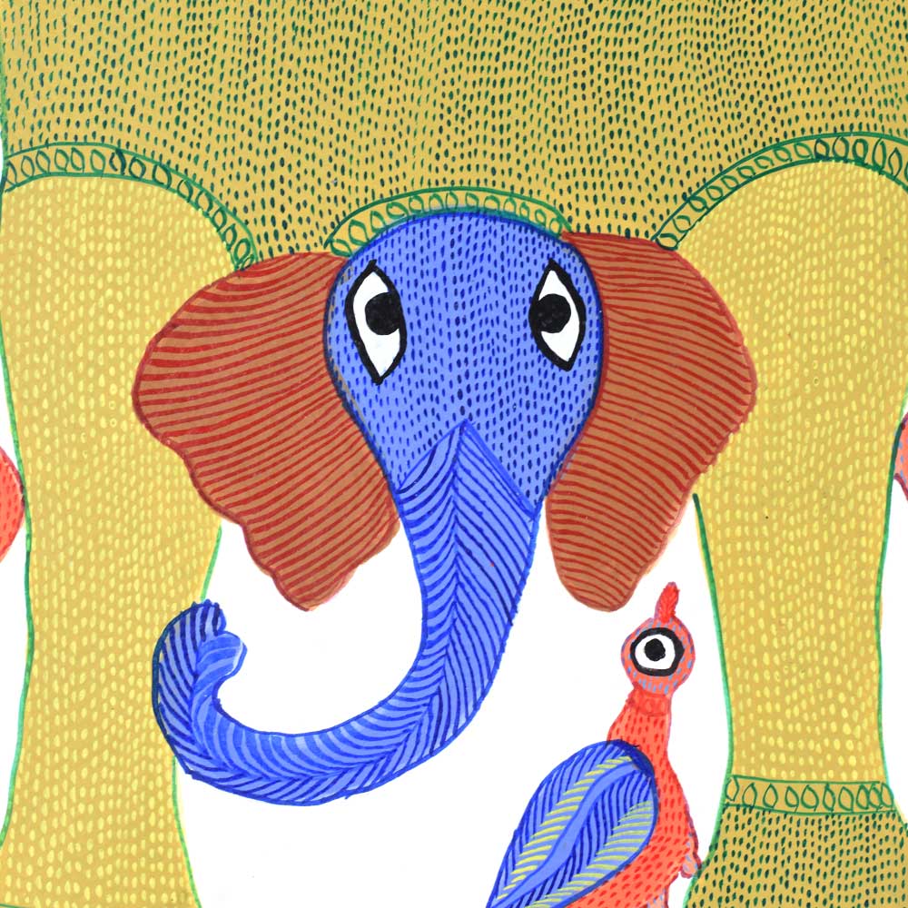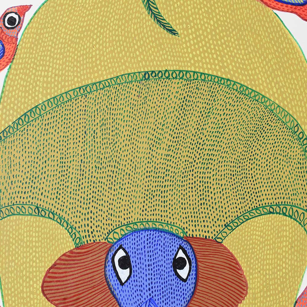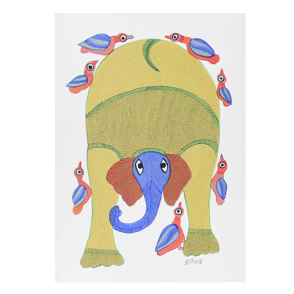 Durgabai Vyam's acrylic painting on paper, depicting an elephant adorned with birds, exemplifies the rich tapestry of Gond art—a traditional tribal art form from Madhya Pradesh, India. In this piece, the elephant, a symbol of strength and wisdom, is intricately embellished with vibrant birds, reflecting the harmonious relationship between animals and nature in Gond mythology. The meticulous dot and line work, characteristic of Gond art, brings the scene to life, infusing it with energy and movement. Durgabai Vyam, born in 1973 in Barbaspur, Madhya Pradesh, is a distinguished artist renowned for her contributions to Gond painting. She began her artistic journey at the age of six, learning the art of digna from her mother—a ritual of painting geometric patterns during weddings and harvest festivals. Her early works were well-received within her community. Over the years, Durgabai has created paintings for various publications and exhibited her works both nationally and internationally. In 2022, she was honored with the Padma Shri, India's fourth-highest civilian award, recognizing her exceptional contributions to the arts.