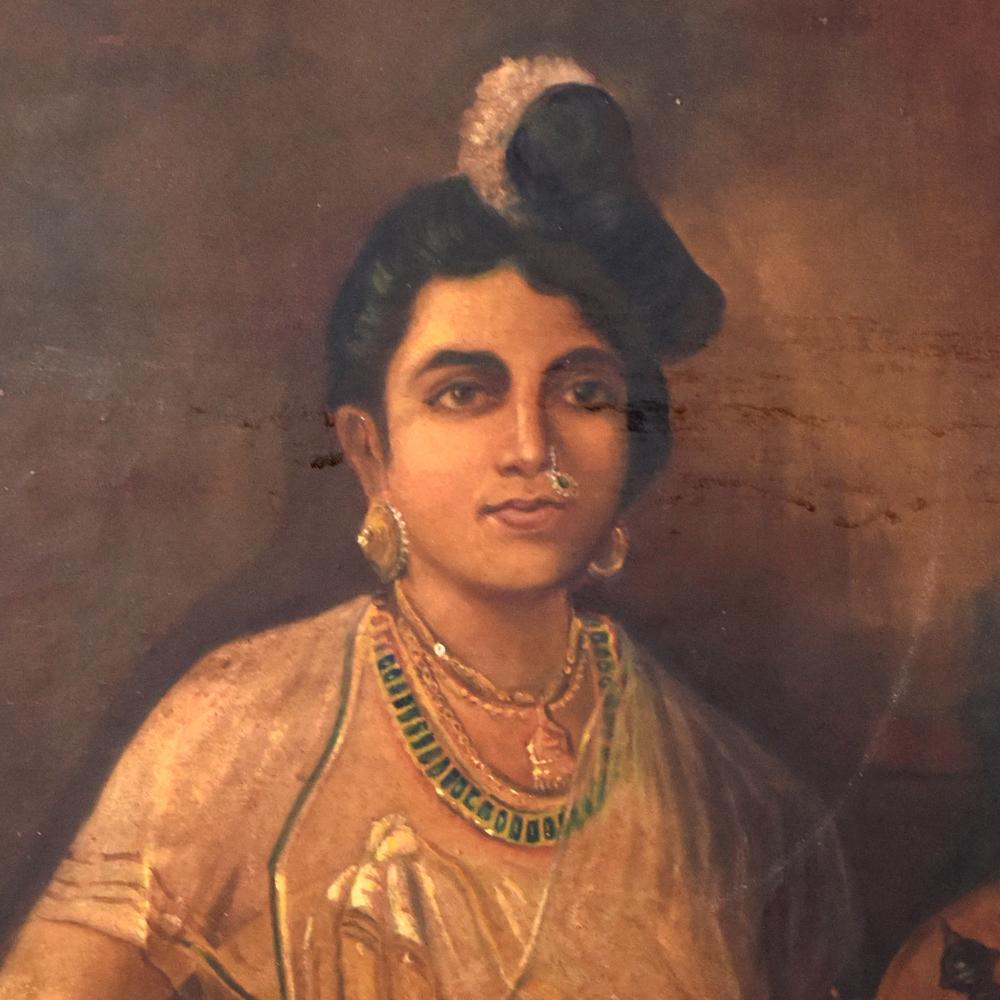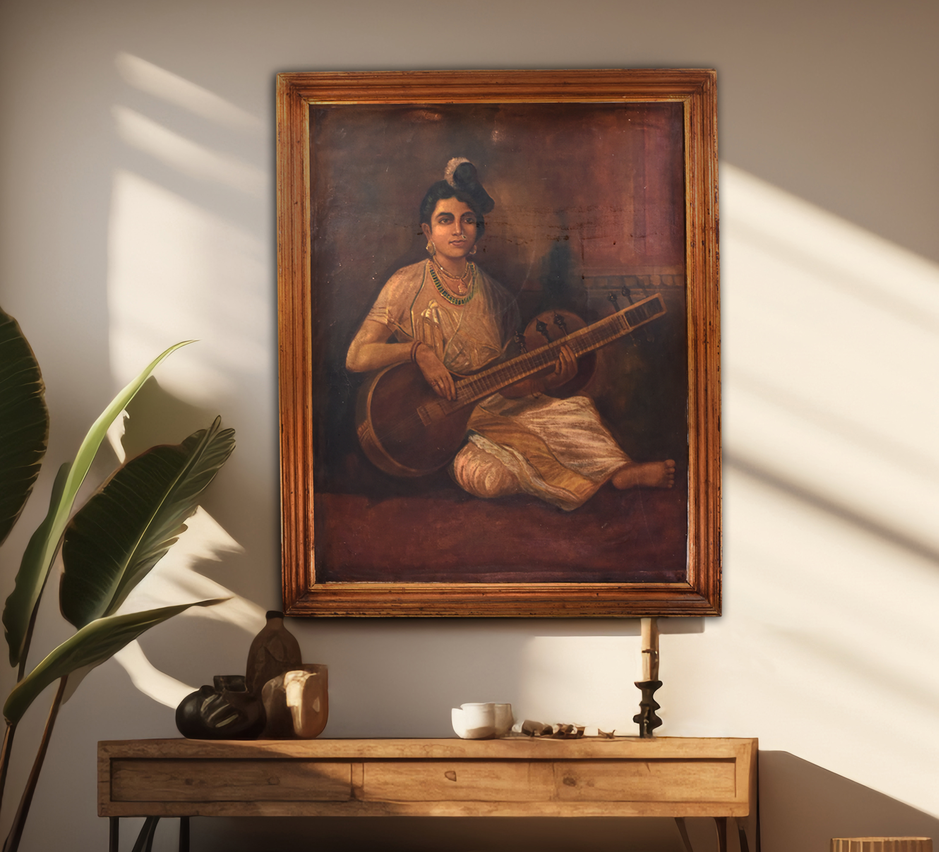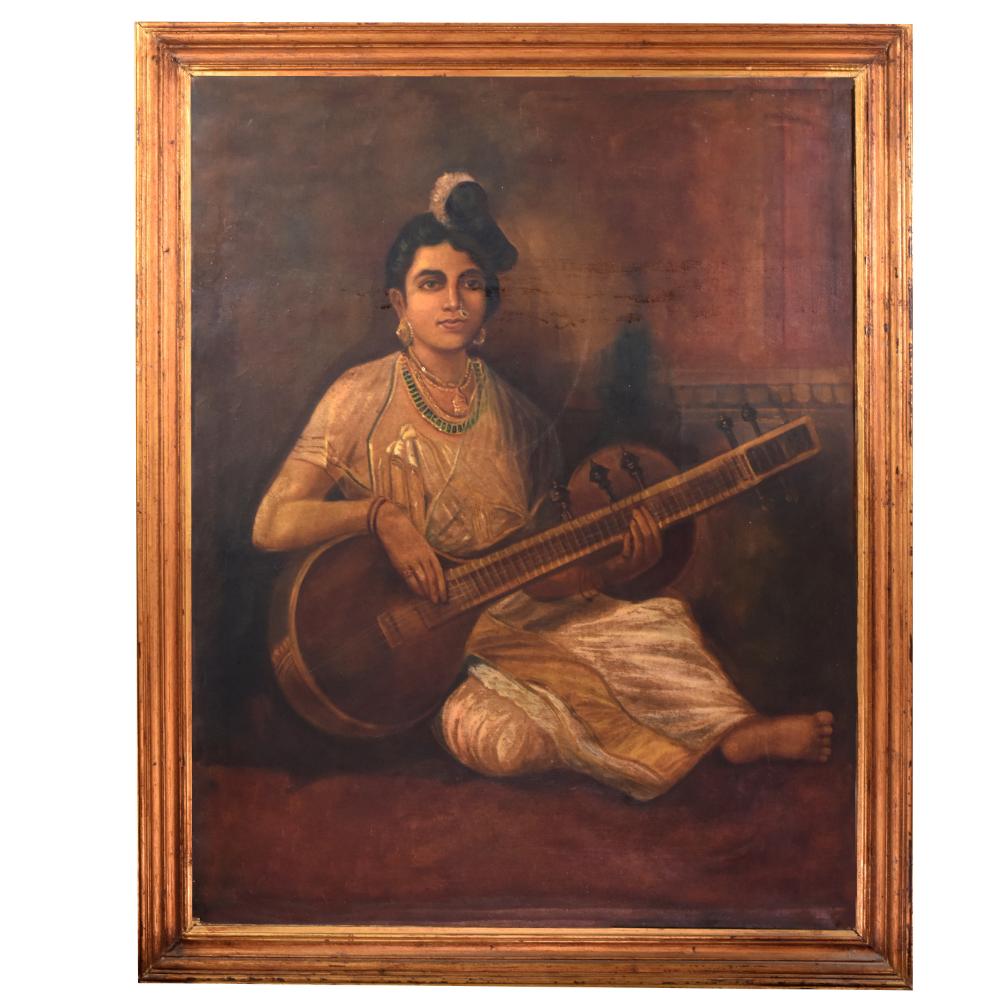- Depicts a lady playing the traditional Indian instrument, the Sitar