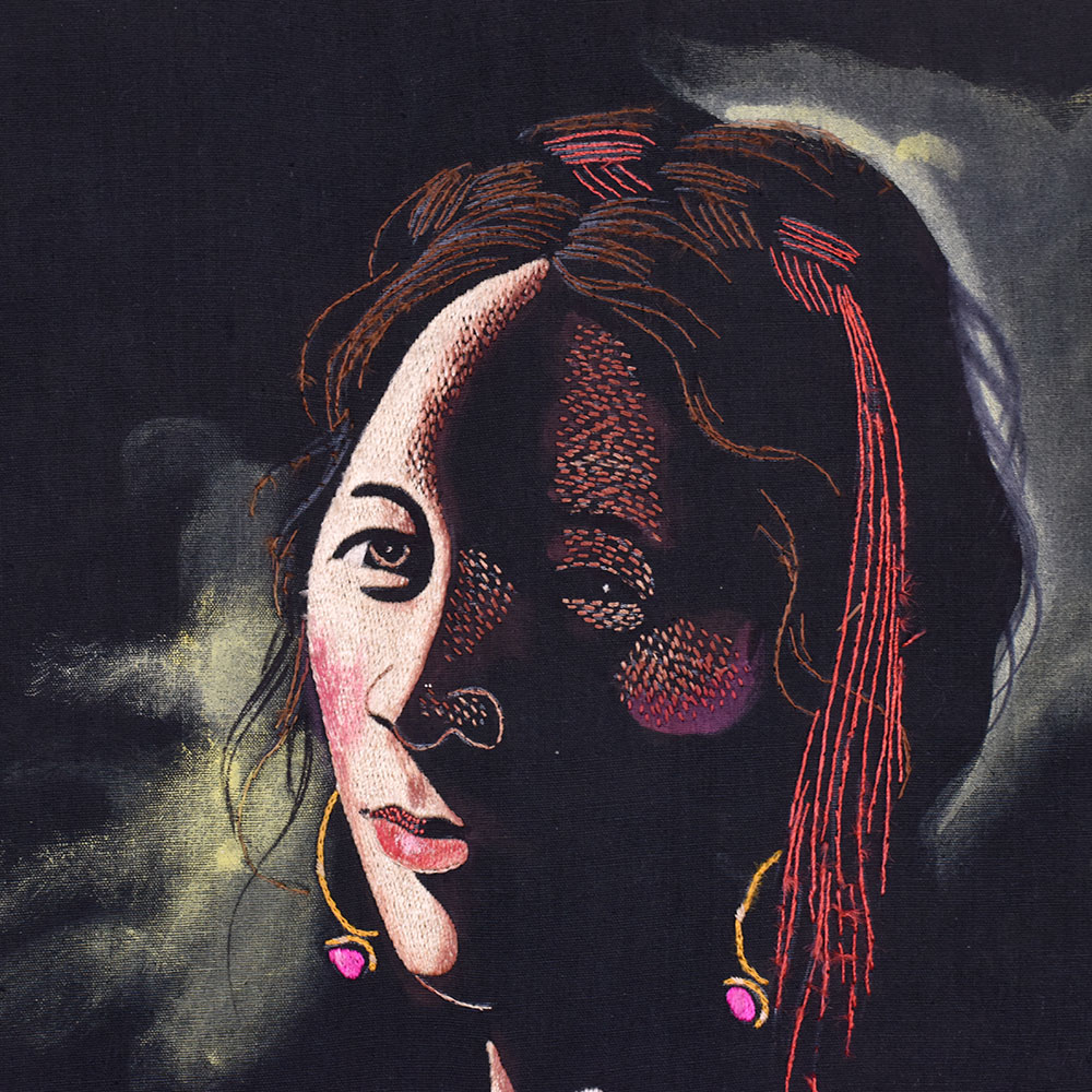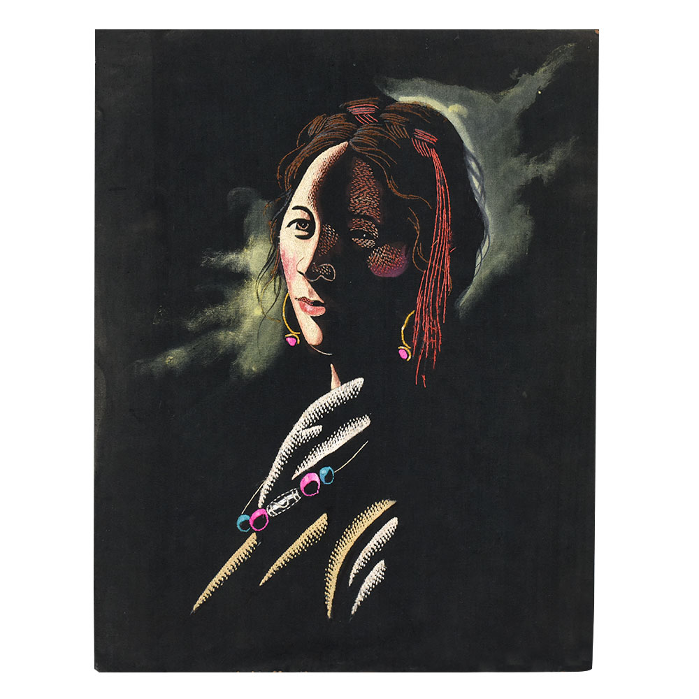 Add a touch of elegance and artistic charm to your interiors with this exquisite cloth painting mounted on hardboard, featuring a graceful portrait of a woman. The artwork is crafted with fine hand-painted detailing, highlighting the woman’s expressive face, delicate jewelry, and flowing hair against a dramatic dark background. The play of light and shadow adds depth and intrigue, making this piece a captivating focal point for any decor style. Accented with subtle tones of pink, gold, and green, the painting radiates both traditional craftsmanship and contemporary appeal. Mounted securely on hardboard, it offers durability and a refined finish, ensuring long-lasting beauty. Perfect for living rooms, hallways, or personal collections, this portrait painting also makes a unique and thoughtful gift for art lovers.