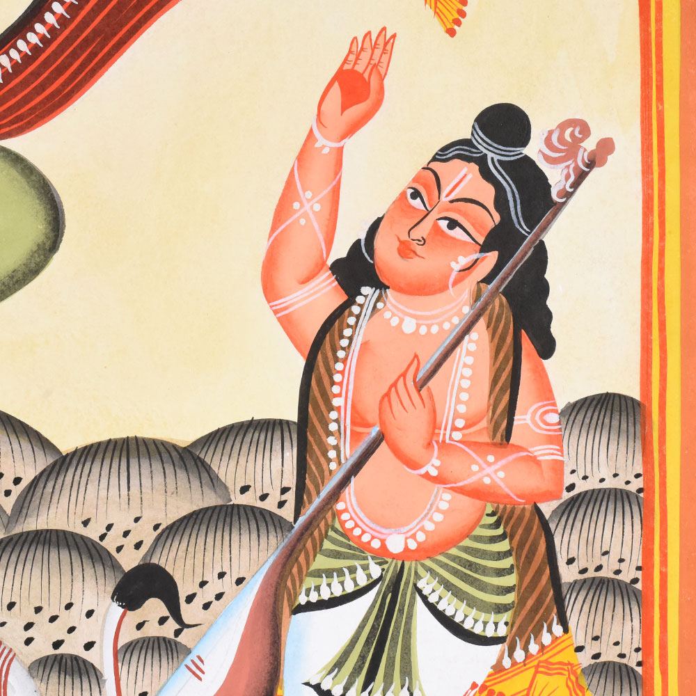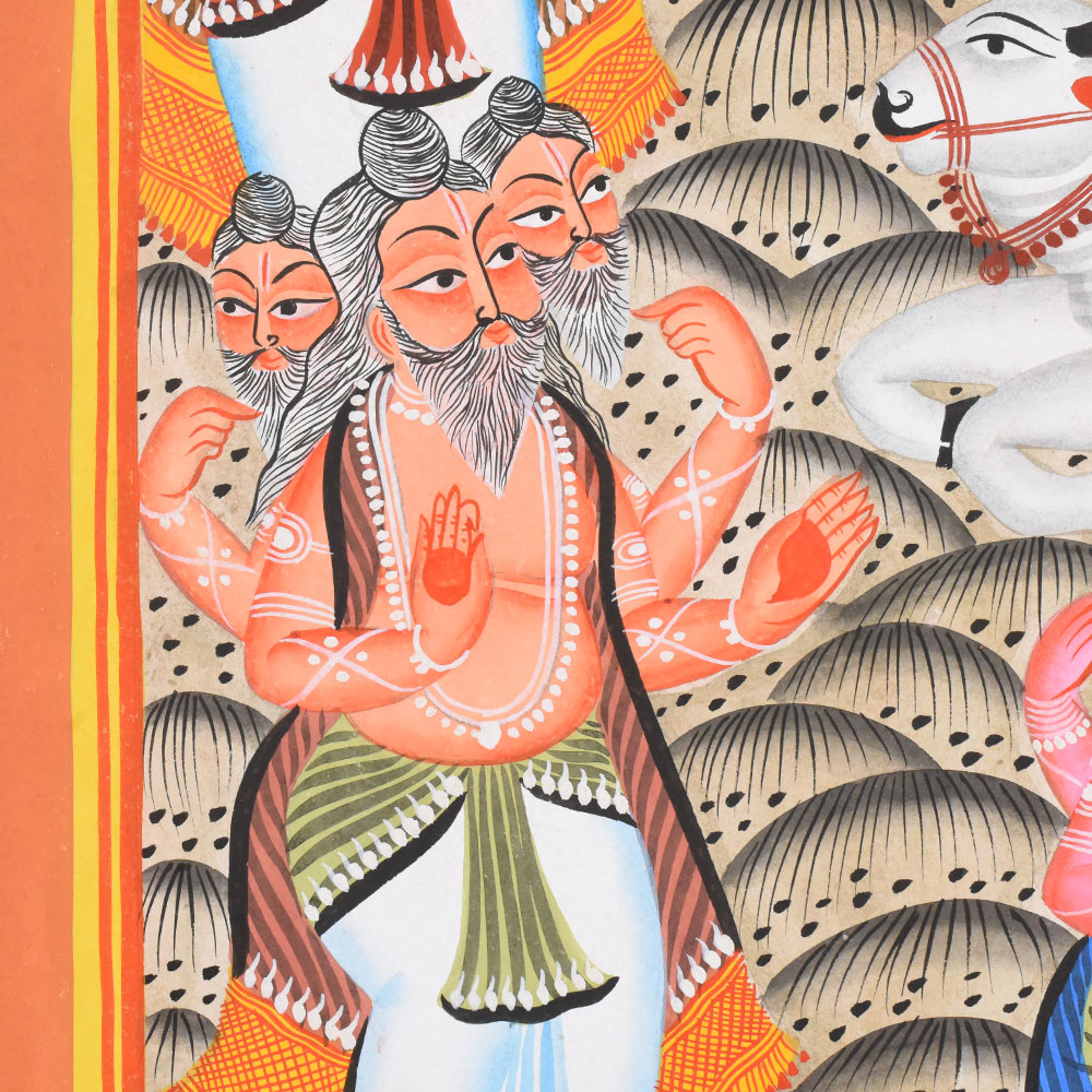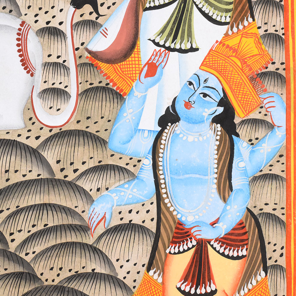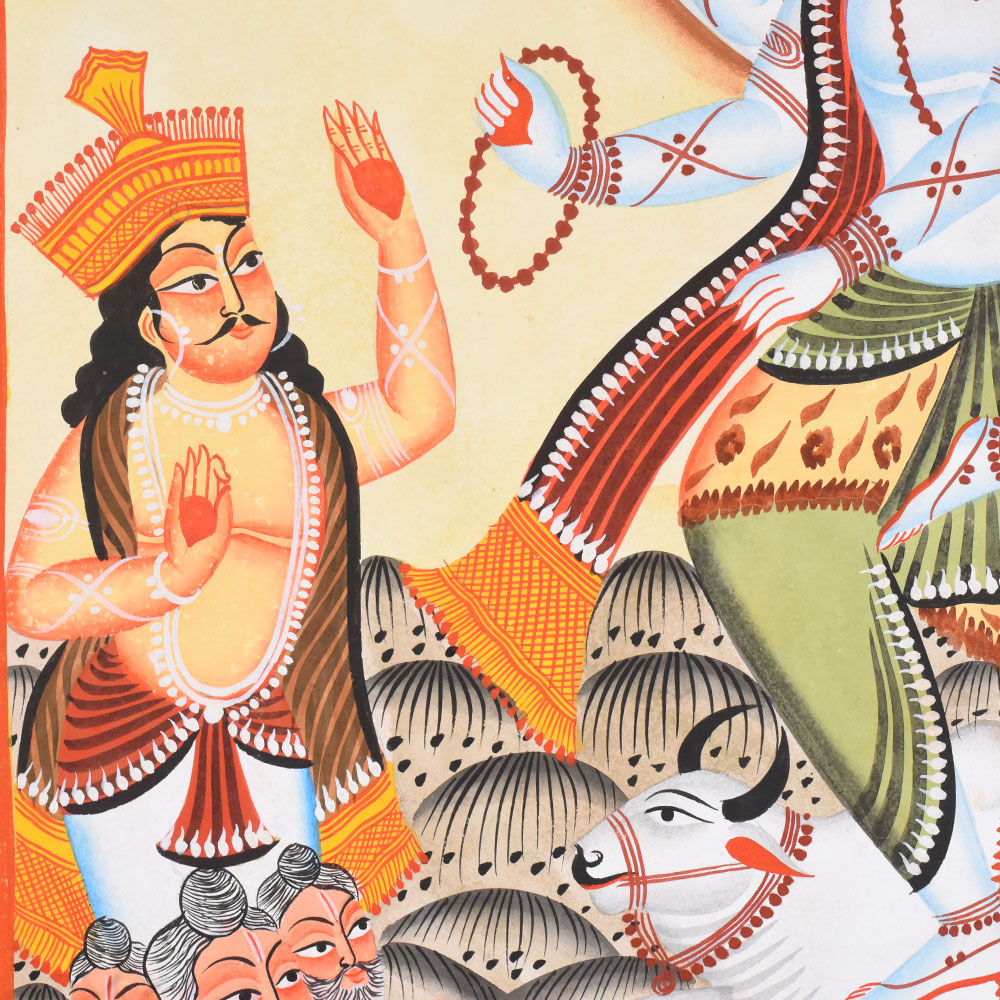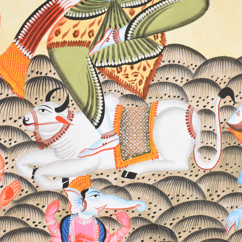 This Kalighat painting on cloth and paper depicts Lord Shiva as Nataraja, the cosmic dancer, presented in a dramatic yet devotional folk idiom characteristic of the Kalighat school. Shiva occupies the central position, suspended in a graceful dance pose above a stylized landscape of rounded, patterned forms that suggest mountains or sacred ground. His ash-blue body is outlined with confident, flowing lines, and a radiant white halo behind his head emphasizes his divine presence. One hand holds a trident, another a flame symbolizing destruction, while the remaining hands form expressive gestures that balance creation and protection. Shiva is shown seated upon or dancing above Nandi, the sacred bull, who is rendered in soft whites and greys with decorative detailing, reinforcing his role as Shivas loyal vehicle. The surrounding figuressaints, devotees, and divine attendantsare arranged symmetrically around the central figure, their raised hands and musical instruments suggesting reverence, movement, and sound. Their faces, with large almond-shaped eyes and simplified expressions, reflect the Kalighat painters focus on emotional immediacy rather than realism. The palette is warm and vibrant, dominated by reds, yellows, whites, and blues, applied in flat washes with minimal shading. Decorative borders frame the composition, while the background remains uncluttered, allowing the figures to command attention. Executed on cloth and paper, the painting combines sacred symbolism with popular visual language, making the divine accessible to everyday viewers. The scene conveys both cosmic energy and devotional intimacy, embodying the spirit of Kalighat art as a bridge between mythology, ritual, and folk expression.