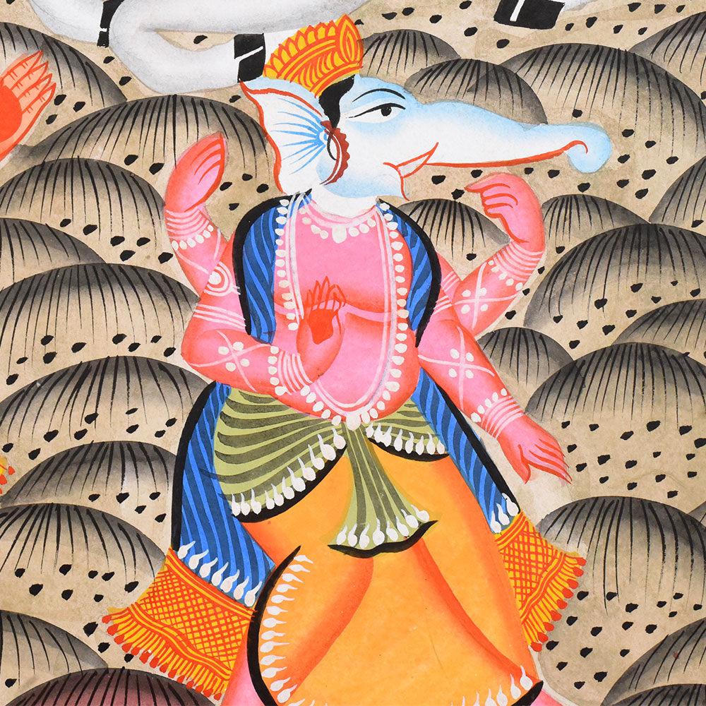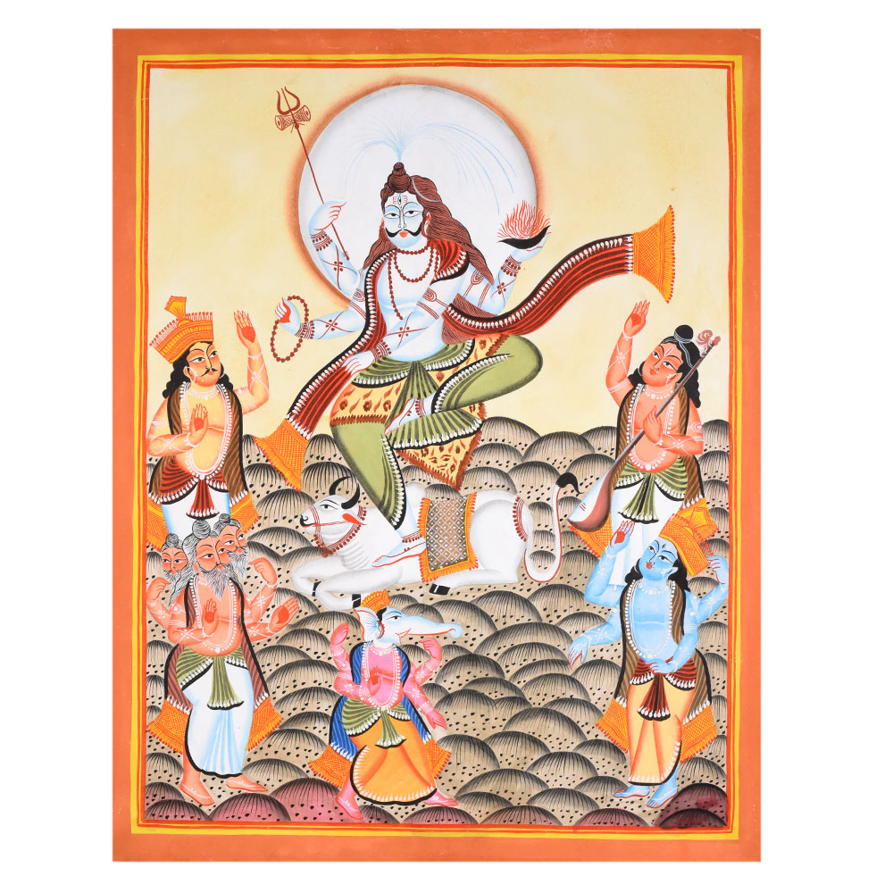 Central depiction of Lord Shiva as Nataraja with trident, flame, and expressive dance posture Presence of Nandi the bull beneath Shiva, richly decorated and symbolically placed Surrounding devotees and attendants shown in rhythmic, reverential poses Bold outlines, flat color planes, and a glowing halo typical of Kalighat painting styleProduct Specification