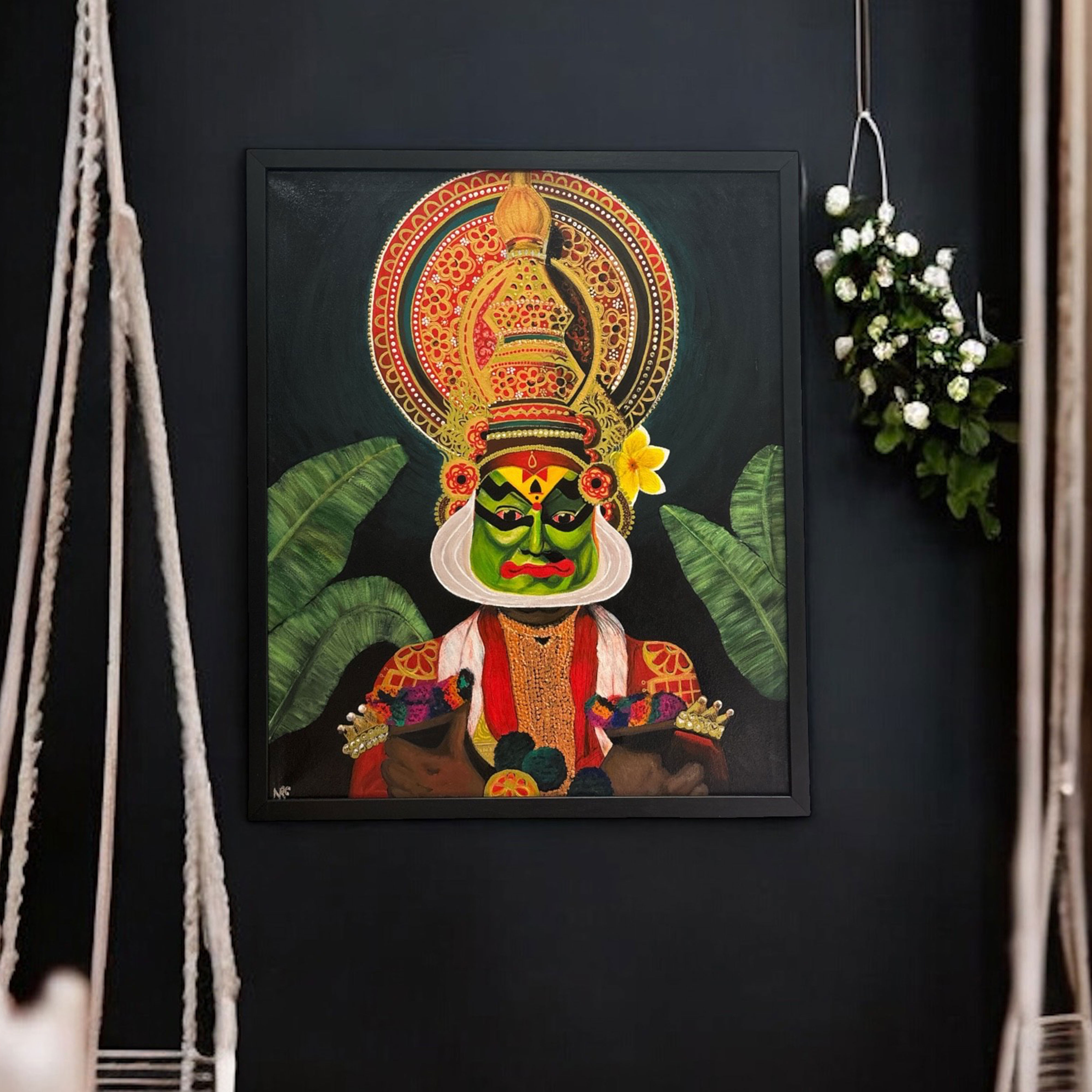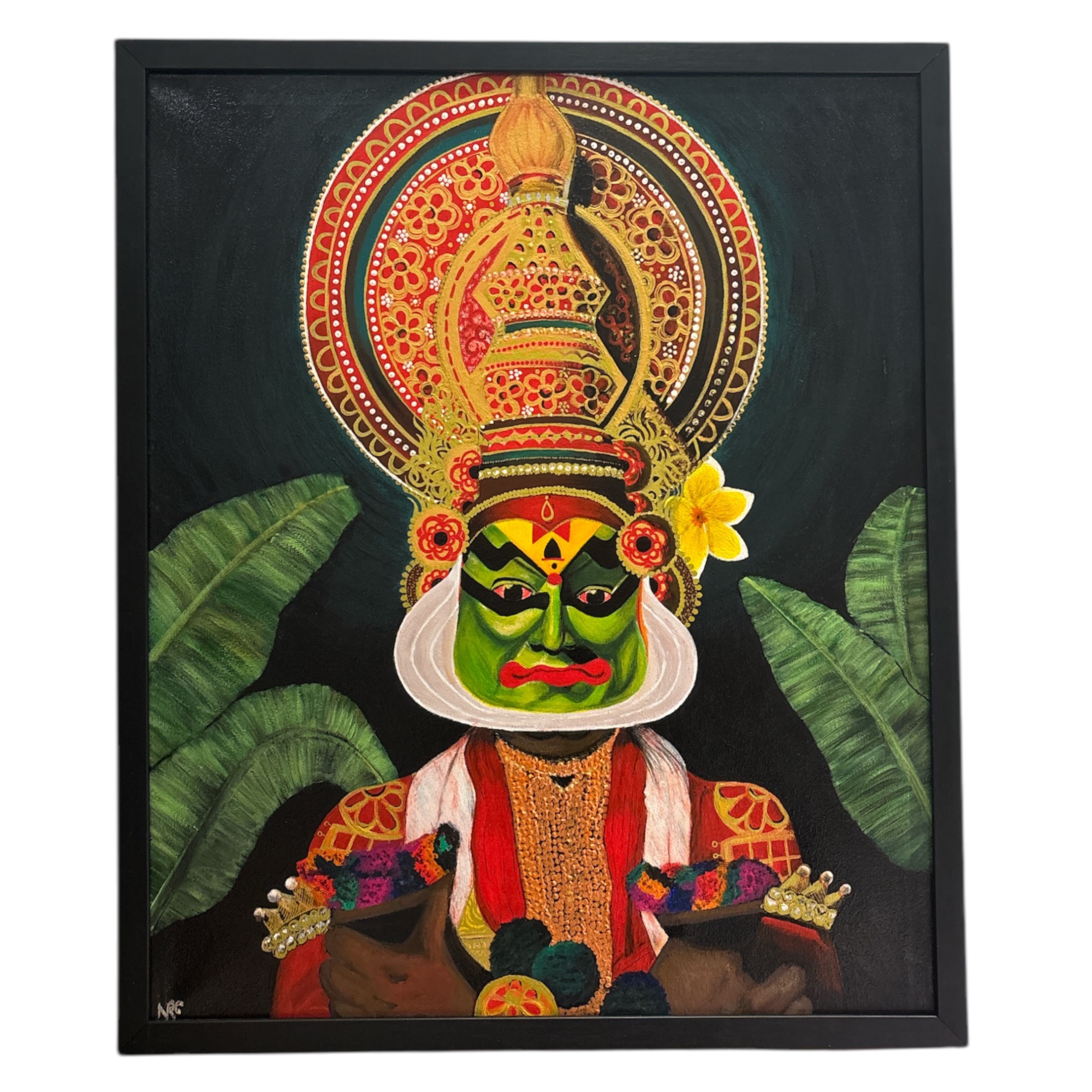 Acrylic painting of a traditional Indian folk dancer native to South India with banana leaves on the side to add to the cultural significance.