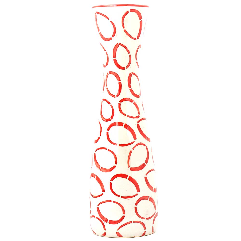 A very retro looking flower vase that has beautiful orange rings on white base ceramic flower vase . Inspired from the old world arts, this arty vase in ceramic is hand-painted in bright colors to bring the perfect ethnic flavors in the surroundings. Very catchy and rare design to suit all kinds of interiors.