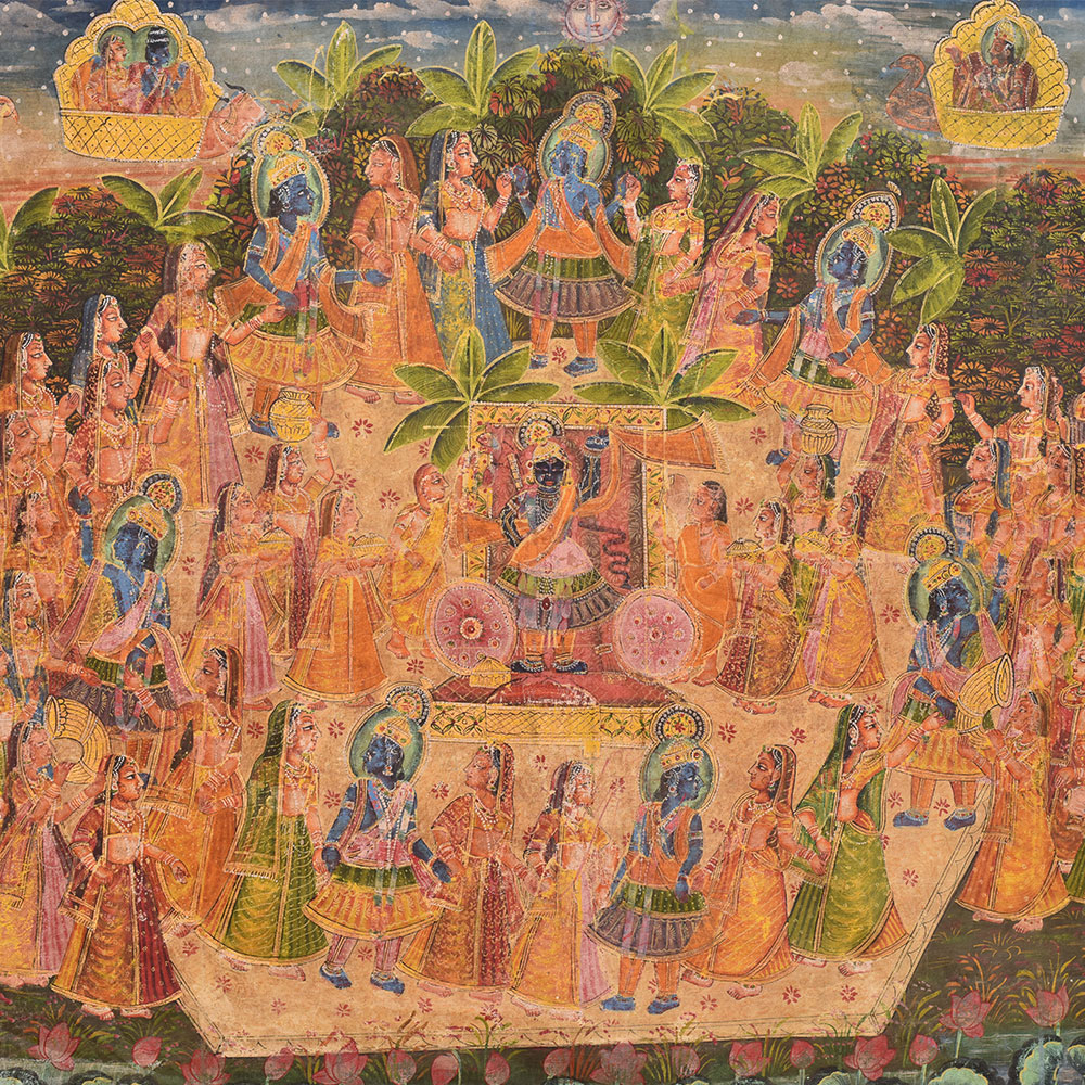 This ancient Pichwai Painting showing Maha Ras performed by Lord Krishna. This is actually a devotional dance of ShrinathJi with gopis as performed on sharad poornima or full moon day. The border shows many Kamdhenu cows painted in the entire Frame, Pichwai paintings are perfect for Home , hotel, office and shop decoration. Diwali gift, wedding gift and new year gift for your near and dear ones.