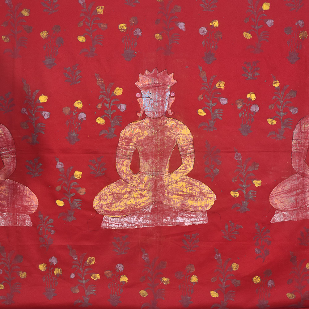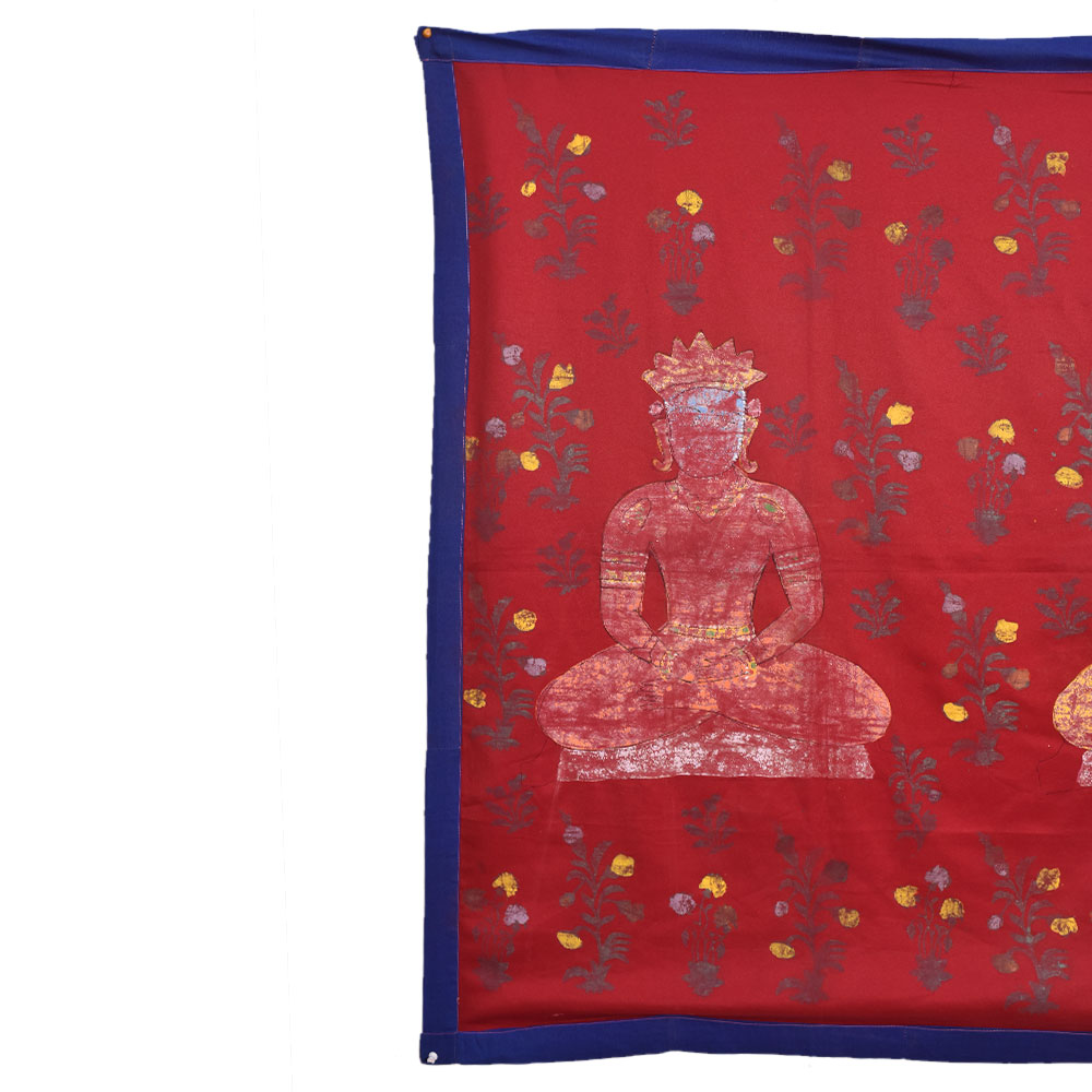 An exquisite pichwai painting on fabric cloth that depicts three Jain gurus in a state of deep meditation, creating a serene and peaceful atmosphere in any room it is placed. The painting is set against a vibrant red background, representing the energy and vitality of life, while the intricate floral patterns adorning it symbolize the beauty and grace of nature. The painting has a beautiful blue border that adds a touch of elegance to the overall composition. The border features intricate designs and patterns that reflect the talent and skill of the professional Indian artists who created it. The painting is painted in multi-colour, with each shade carefully selected to bring out the beauty of the image. This pichwai painting is an auspicious gift for any family, friend, or relative on special or festive occasions. Its calming presence makes it an excellent addition to any prayer room or temple, allowing one to connect with their spiritual side. The painting is a testament to the rich cultural heritage of India and is sure to be treasured by generations to come.