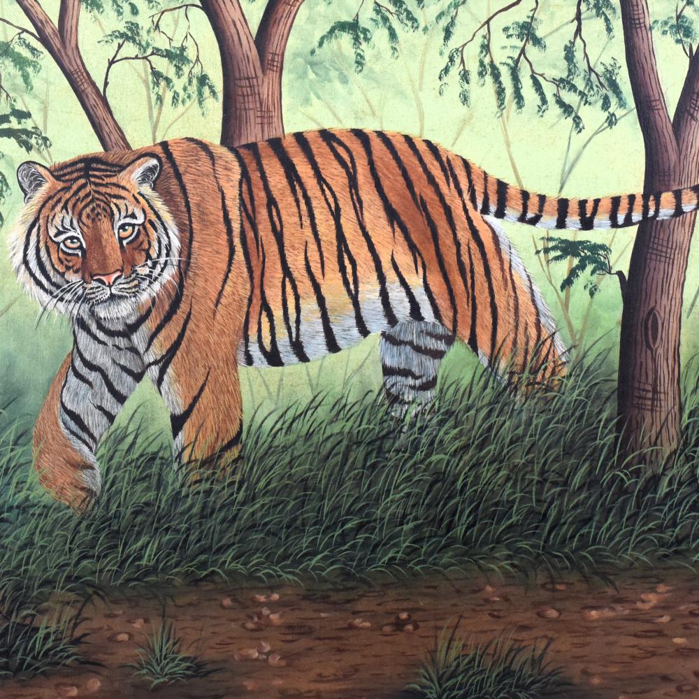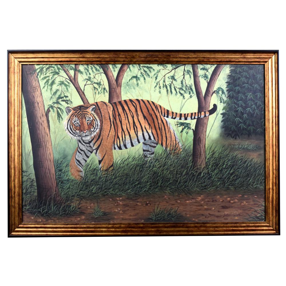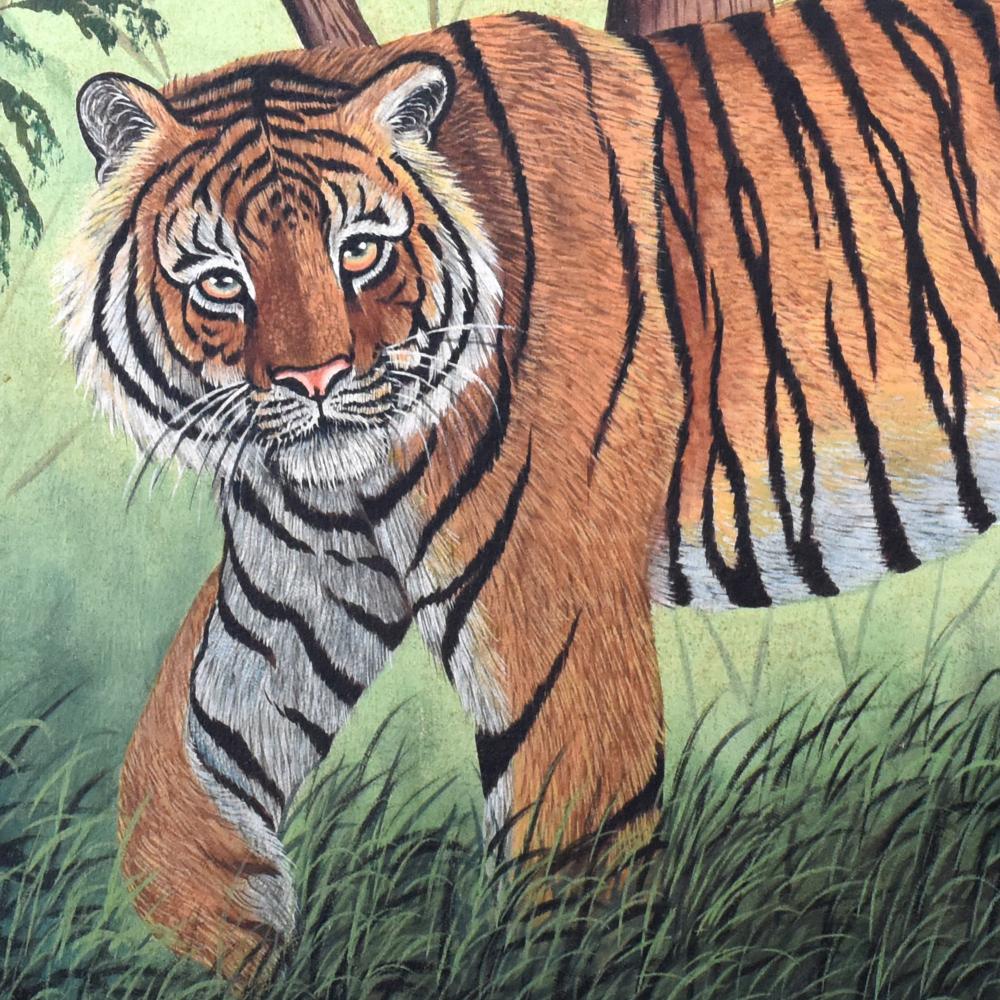 - Stunning Hardboard painting of a powerful tiger in a lush, verdant forest