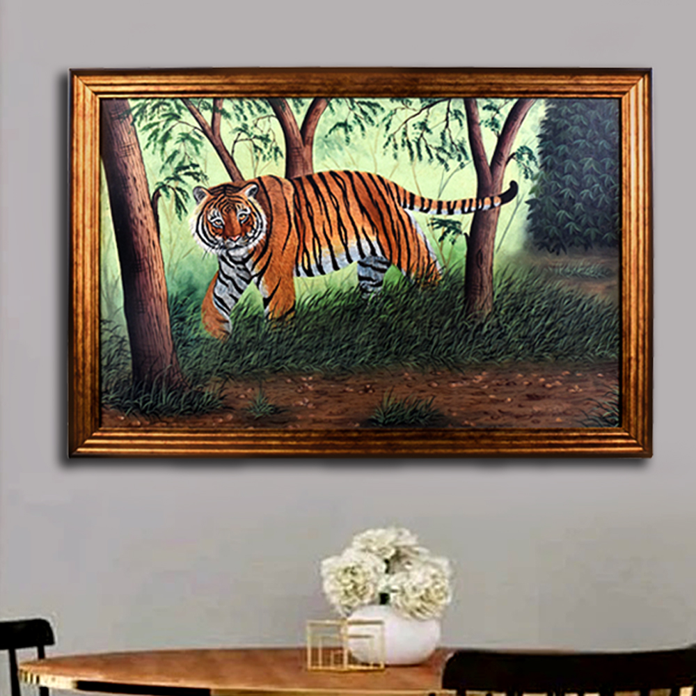 Gaze into the piercing eyes of this magnificent feline and feel the raw energy of the wild. This Hardboard painting transports you to the heart of the jungle, where the tiger reigns supreme. The rich, earthy tones and verdant foliage create a sense of depth and atmosphere, while the tiger's powerful muscles and regal pose command attention. This Hardboard painting is a must-have for nature lovers, art enthusiasts, and anyone seeking to infuse their space with the untamed spirit of the animal kingdom. Hang it in your living room to create a striking focal point, or place it in your bedroom for a peaceful, rejuvenating ambiance. Wherever you choose to display it, this Hardboard painting will elevate your décor and ignite a sense of wonder and appreciation for the natural world.