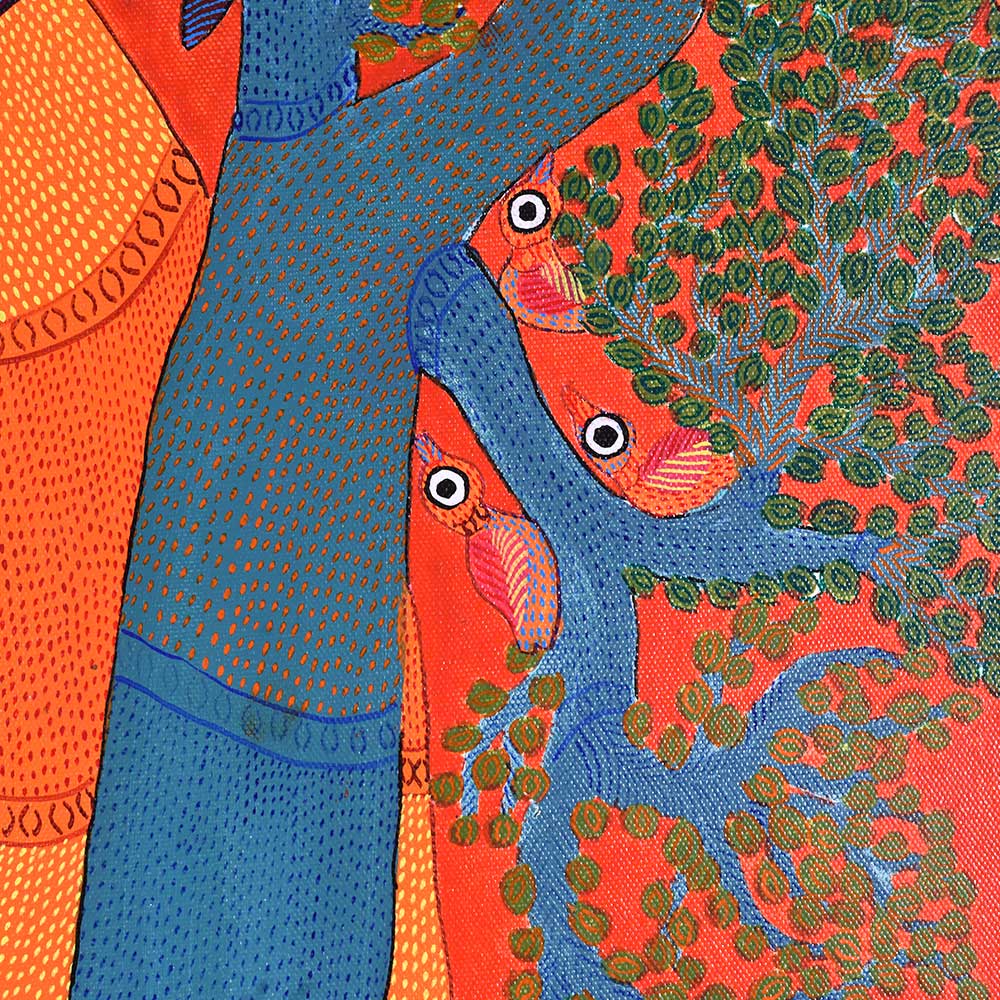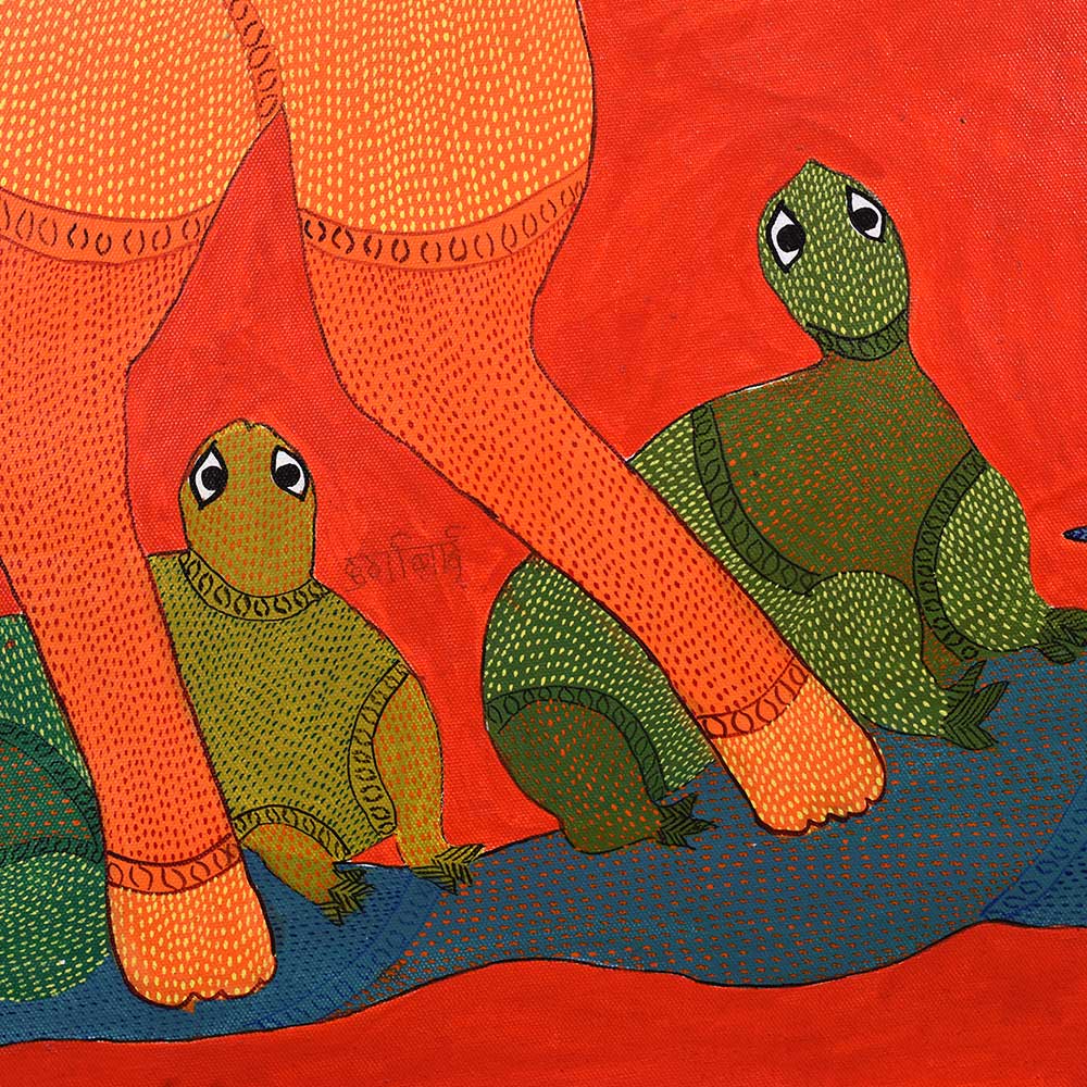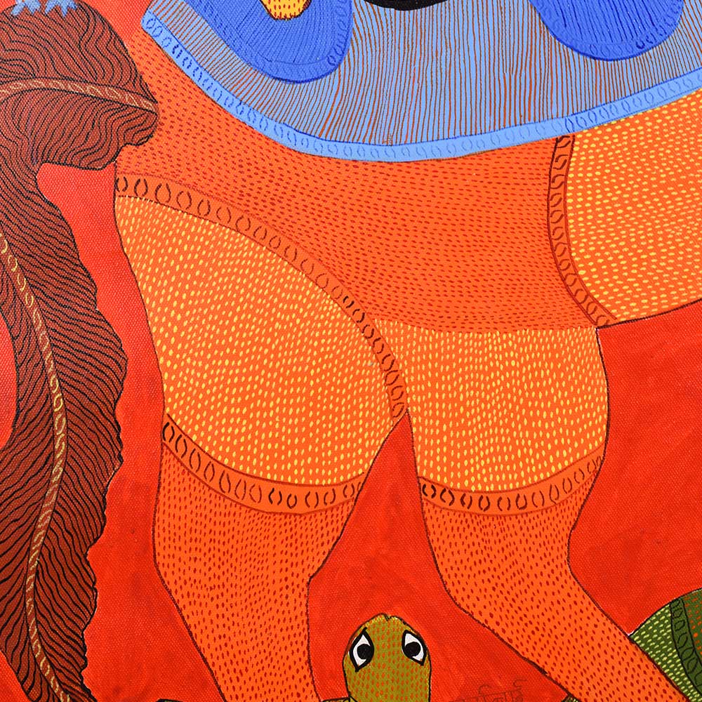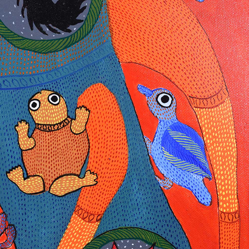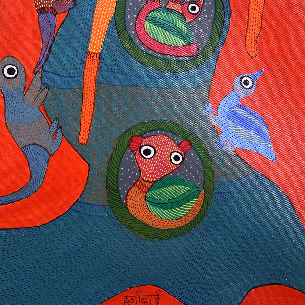 This decorative Gond Art acrylic painting on paper by Durgabai Vyam showcases the artist’s exceptional skill in blending traditional motifs with modern aesthetics without frame. The painting features a vibrant array of intricate patterns, carefully rendered with vivid acrylic paints. Durgabai’s signature style of geometric precision and organic fluidity is evident in the details, creating a sense of harmony between the shapes and colors. The composition is dynamic, with contrasting elements that reflect the deep spiritual connection of the Gond people with nature. The use of acrylics brings texture and depth to the piece, making the painting come alive with energy. The animals, tree, and abstract forms are meticulously arranged, each symbolizing various aspects of nature’s balance and the interconnectedness of all living things. Durgabai Vyam, a renowned Gond artist from Madhya Pradesh, is a celebrated figure in the world of tribal art. She was awarded the Padma Shri in 2022 for her exceptional contributions to the preservation and promotion of Gond Art. Durgabai’s work reflects a deep understanding of nature, mythology, and the cultural heritage of the Gond people. Her art often incorporates themes of spirituality and the natural world, bringing a unique voice to the modern art scene.