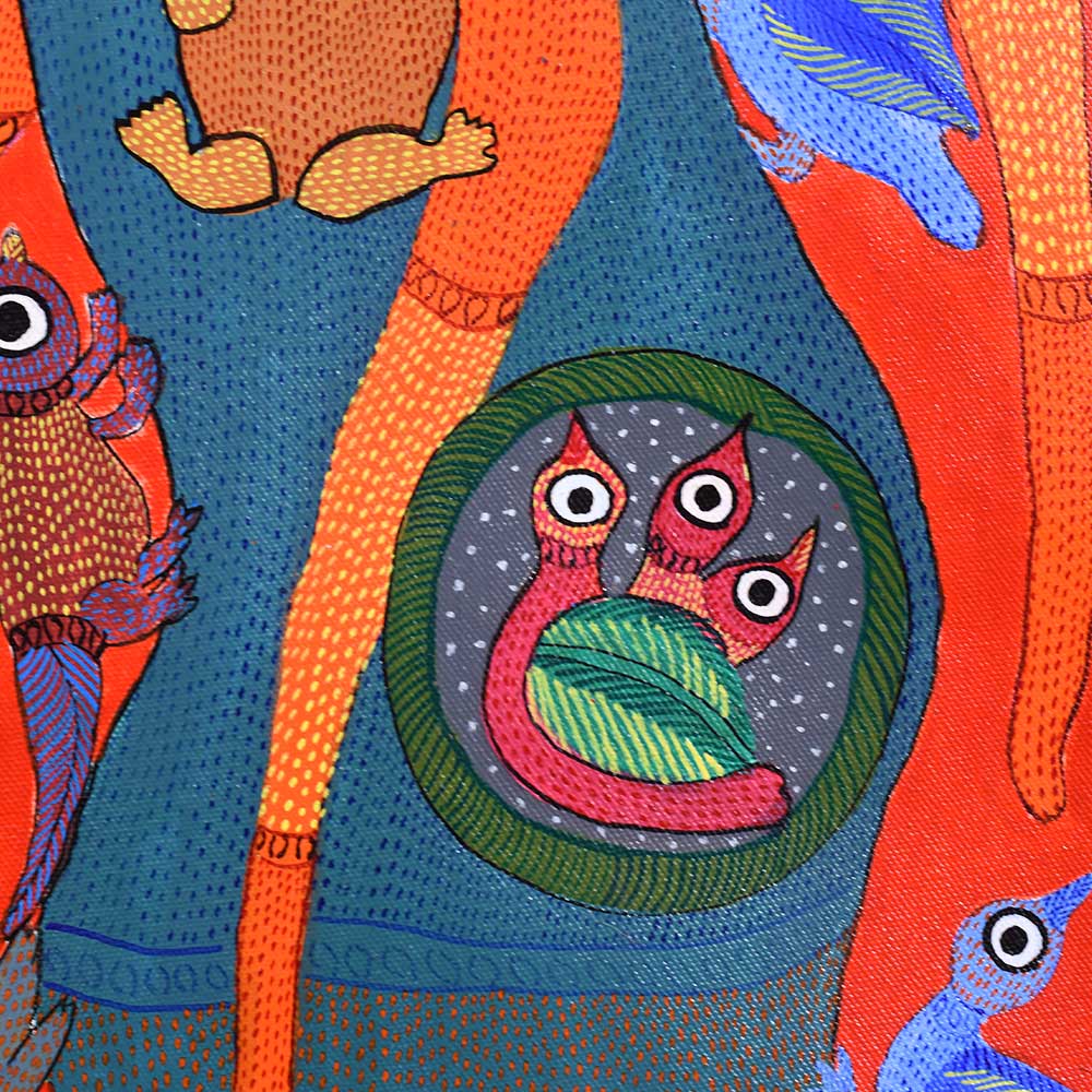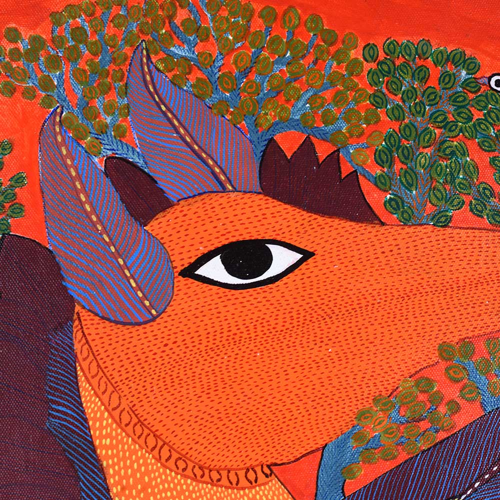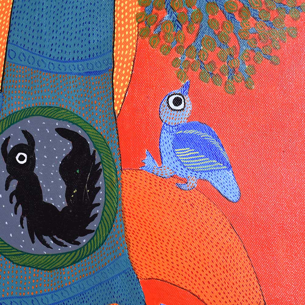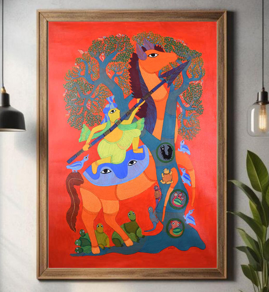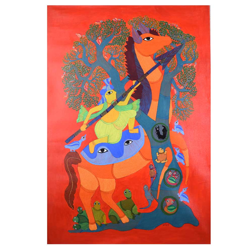 This decorative Gond Art acrylic painting on paper by Durgabai Vyam showcases the artist’s exceptional skill in blending traditional motifs with modern aesthetics without frame. The painting features a vibrant array of intricate patterns, carefully rendered with vivid acrylic paints. Durgabai’s signature style of geometric precision and organic fluidity is evident in the details, creating a sense of harmony between the shapes and colors. The composition is dynamic, with contrasting elements that reflect the deep spiritual connection of the Gond people with nature. The use of acrylics brings texture and depth to the piece, making the painting come alive with energy. The animals, tree, and abstract forms are meticulously arranged, each symbolizing various aspects of nature’s balance and the interconnectedness of all living things. Durgabai Vyam, a renowned Gond artist from Madhya Pradesh, is a celebrated figure in the world of tribal art. She was awarded the Padma Shri in 2022 for her exceptional contributions to the preservation and promotion of Gond Art. Durgabai’s work reflects a deep understanding of nature, mythology, and the cultural heritage of the Gond people. Her art often incorporates themes of spirituality and the natural world, bringing a unique voice to the modern art scene.