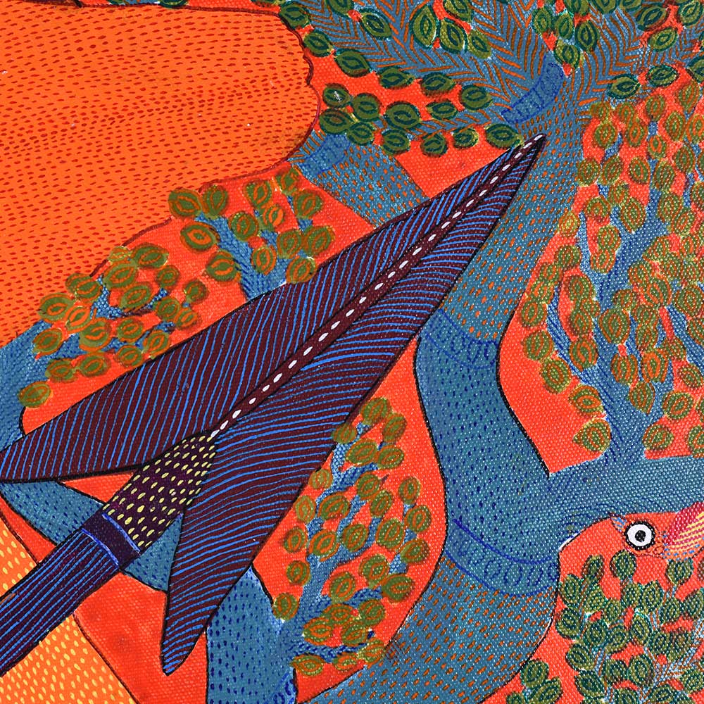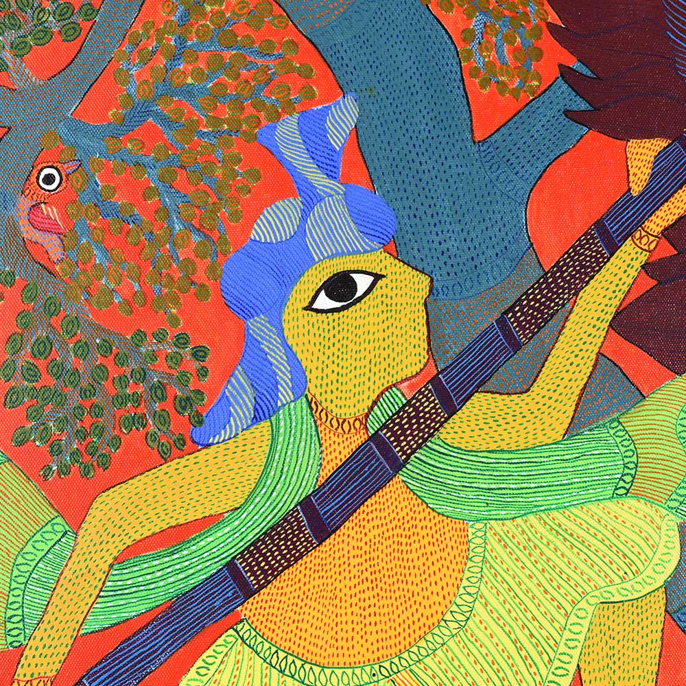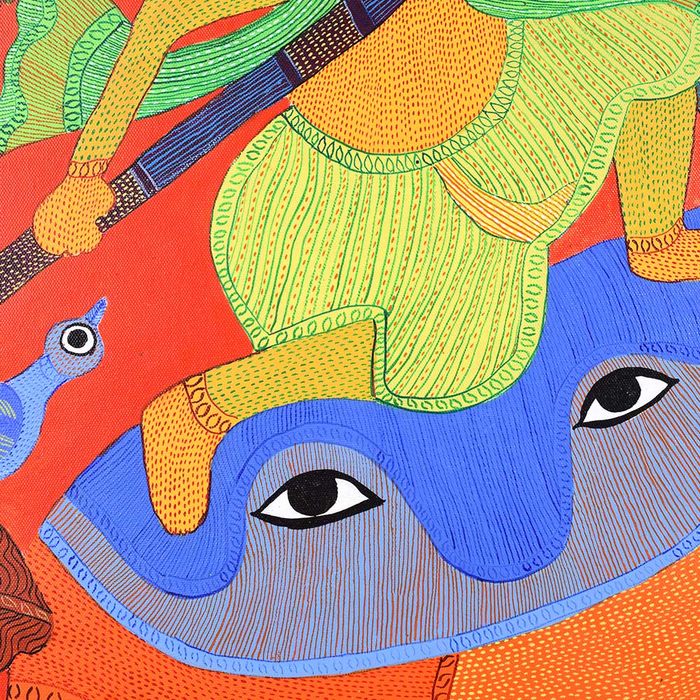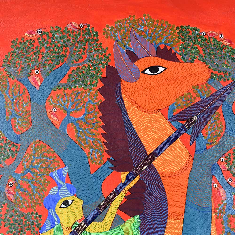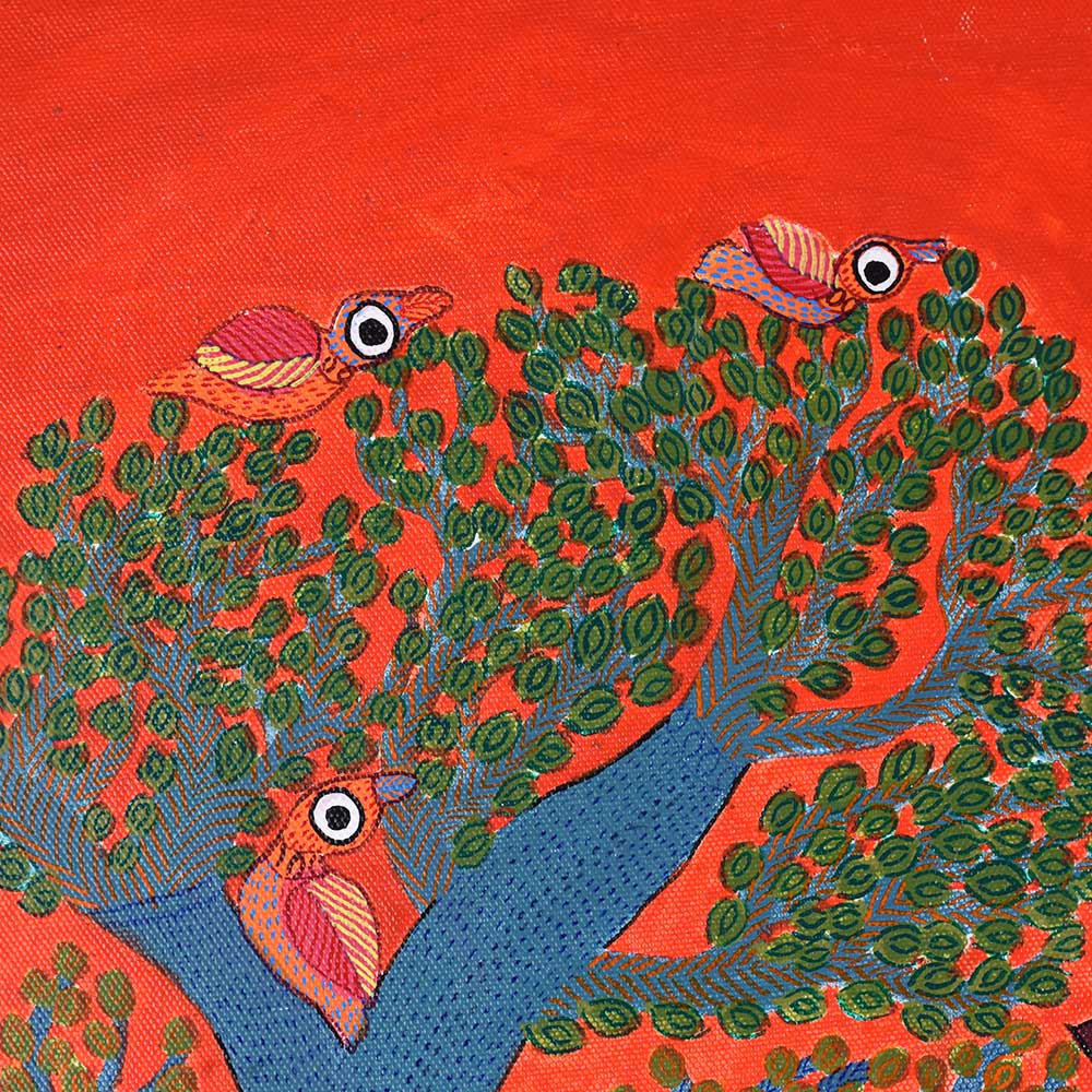 This decorative Gond Art acrylic painting on paper by Durgabai Vyam showcases the artist’s exceptional skill in blending traditional motifs with modern aesthetics without frame. The painting features a vibrant array of intricate patterns, carefully rendered with vivid acrylic paints. Durgabai’s signature style of geometric precision and organic fluidity is evident in the details, creating a sense of harmony between the shapes and colors. The composition is dynamic, with contrasting elements that reflect the deep spiritual connection of the Gond people with nature. The use of acrylics brings texture and depth to the piece, making the painting come alive with energy. The animals, tree, and abstract forms are meticulously arranged, each symbolizing various aspects of nature’s balance and the interconnectedness of all living things. Durgabai Vyam, a renowned Gond artist from Madhya Pradesh, is a celebrated figure in the world of tribal art. She was awarded the Padma Shri in 2022 for her exceptional contributions to the preservation and promotion of Gond Art. Durgabai’s work reflects a deep understanding of nature, mythology, and the cultural heritage of the Gond people. Her art often incorporates themes of spirituality and the natural world, bringing a unique voice to the modern art scene.