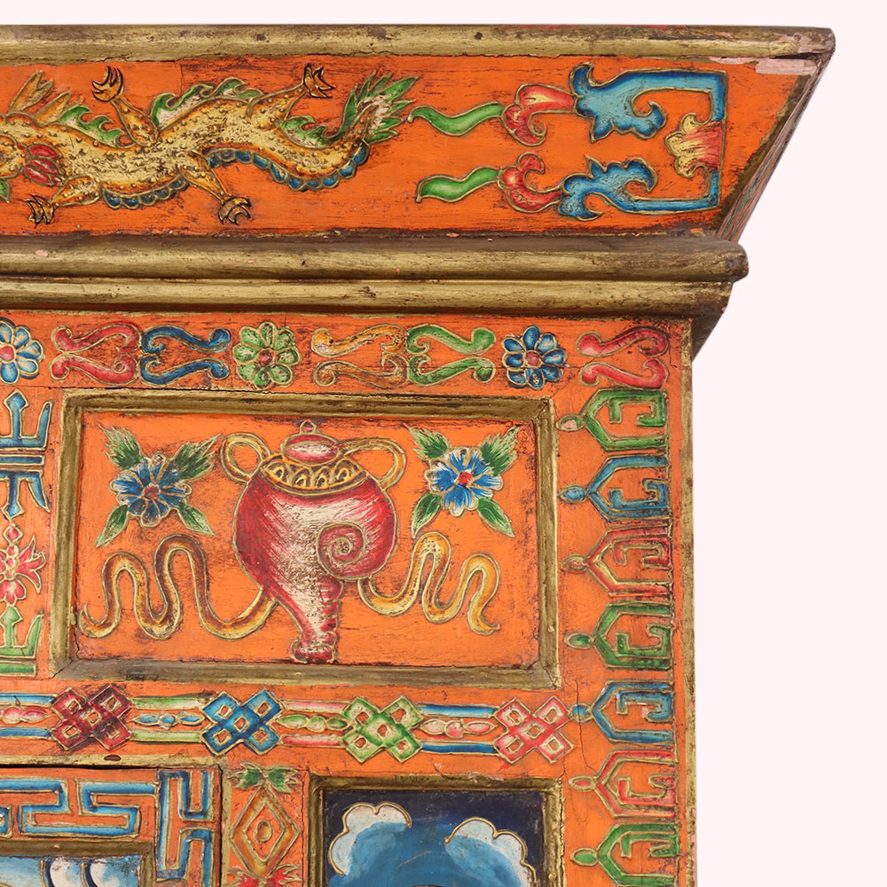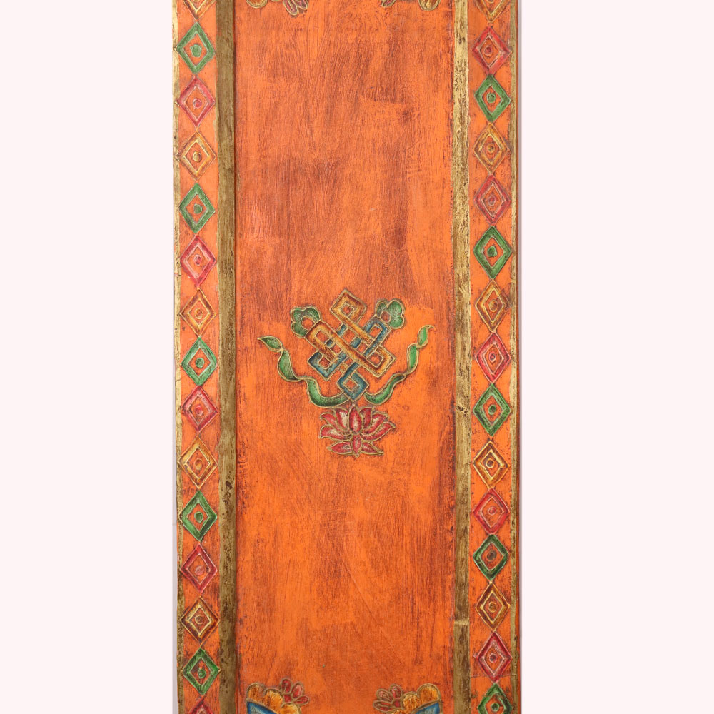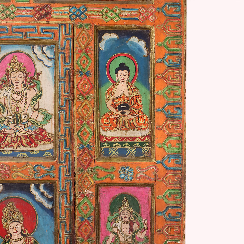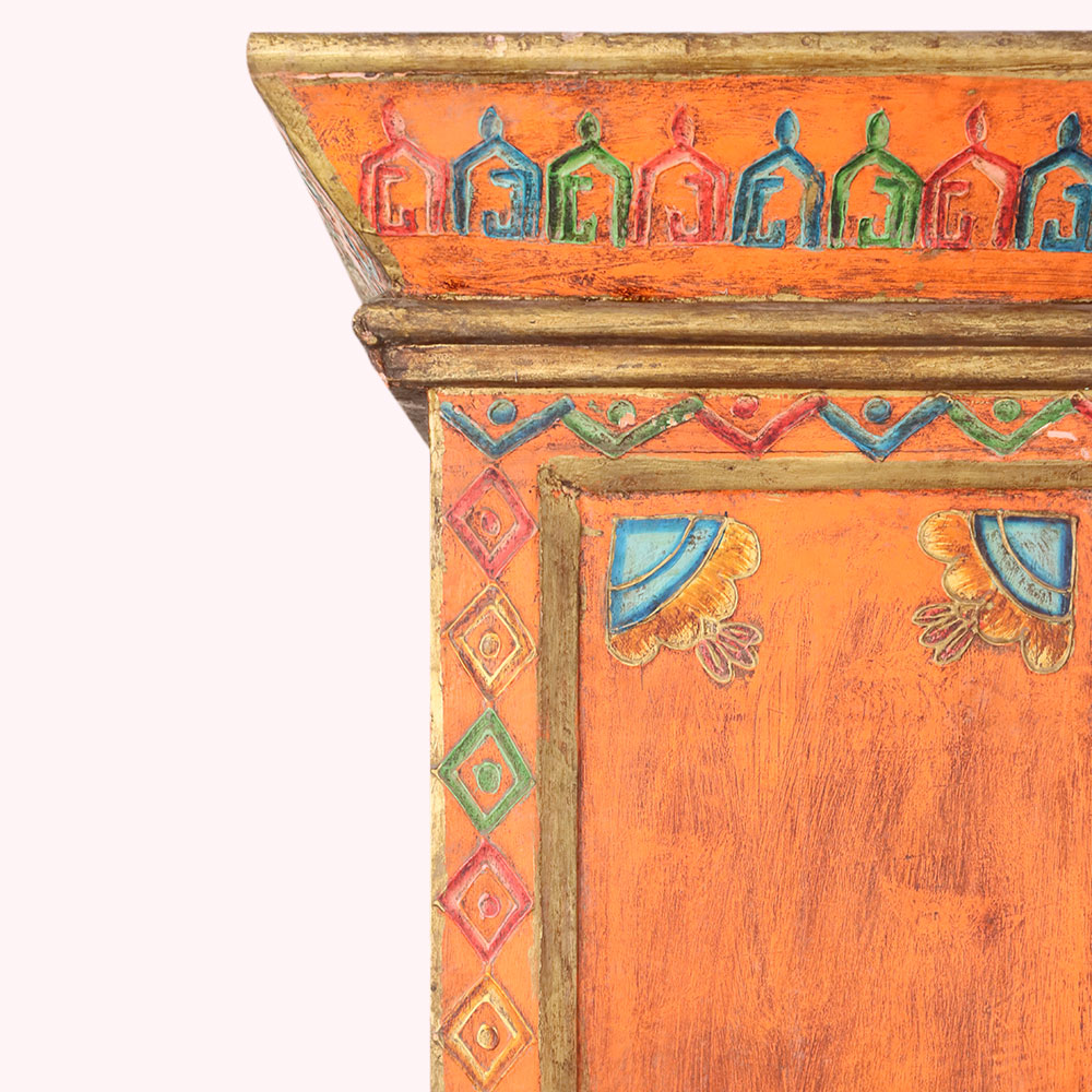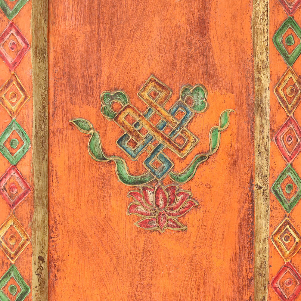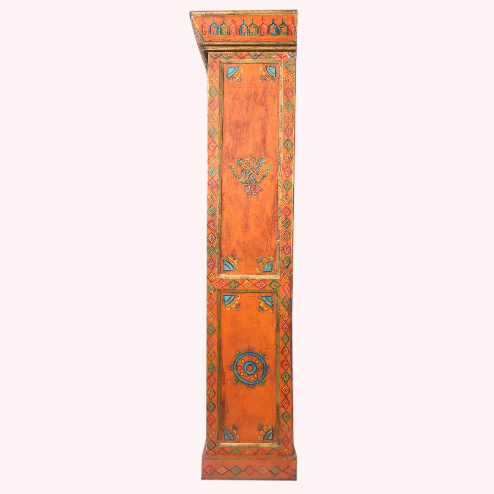 Celebrate traditional artistry with this handmade wooden almirah, exquisitely hand-painted with detailed Buddha figures framed by floral and symbolic borders. The cabinet features a vibrant palette of orange, blue, red, and green, giving it a rich antique appearance and spiritual depth. Designed for both utility and décor, this tall almirah offers ample storage space while serving as a statement piece for your home. Each panel tells a story of devotion and culture, crafted meticulously by skilled artisans who preserve centuries-old Tibetan-inspired techniques. Perfect for meditation spaces, heritage homes, or collectors of spiritual art, this hand-painted wooden almirah combines functionality with cultural elegance.