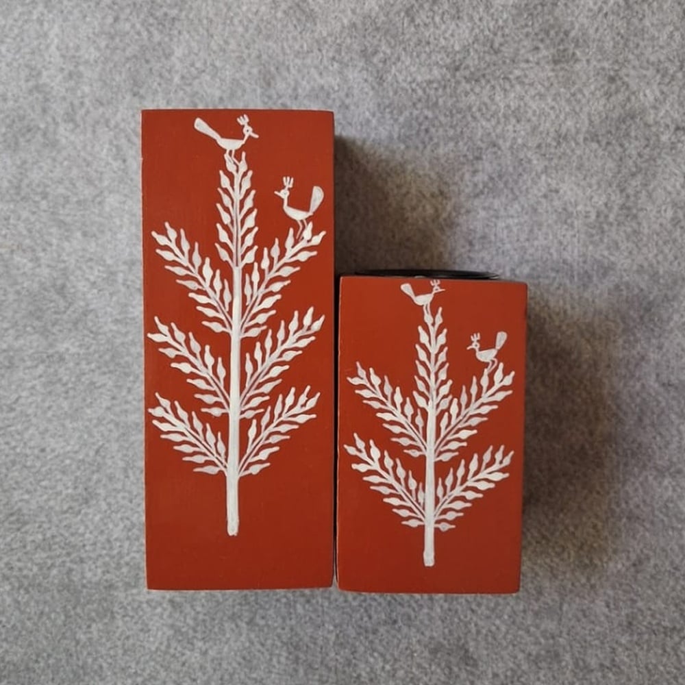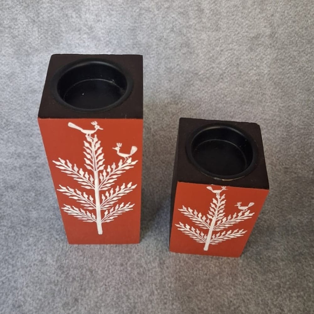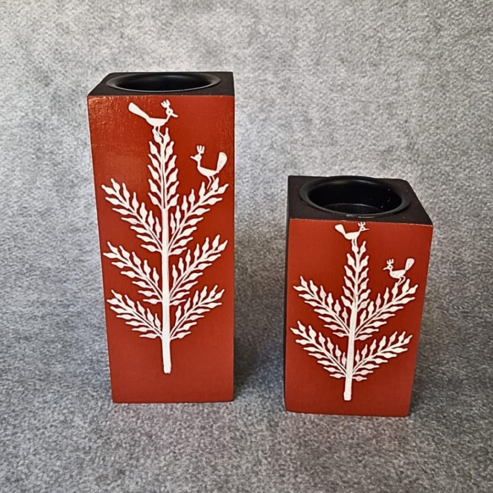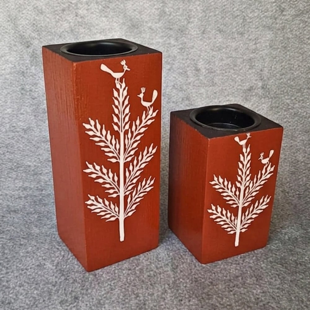 This hand painted wooden candle holder pair features a striking bird and foliage motif, crafted with precision to bring a blend of nature-inspired elegance and modern simplicity into your home. The rich earthy finish combined with fine artwork creates a visually balanced decorative accent for any interior space.