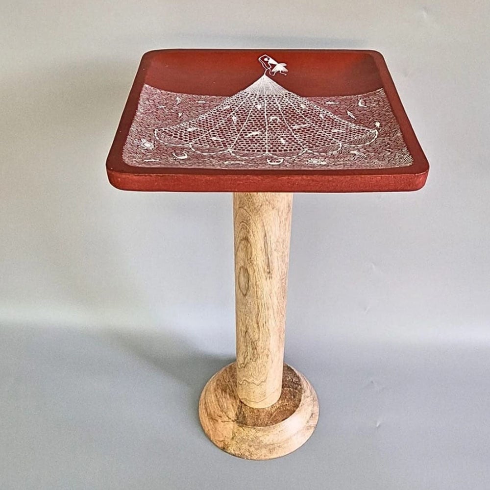 This hand painted wooden side table features a beautifully crafted square top with intricate artwork, paired with a sturdy cylindrical wooden base. Designed as both a functional and decorative piece, it adds an artistic and rustic charm to any living space.